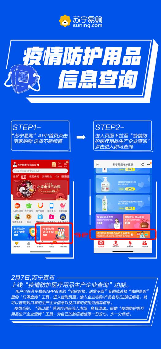 用戶可在蘇寧易購APP首頁的“宅家購物、送貨不斷”專題或選擇“我的易購”里的“口罩查詢”工具,進入查詢頁面。輸入企業(yè)名稱/產品名稱/注冊證編號,就可以查詢到口罩的生產企業(yè)信息以及口罩的使用范圍等信息。