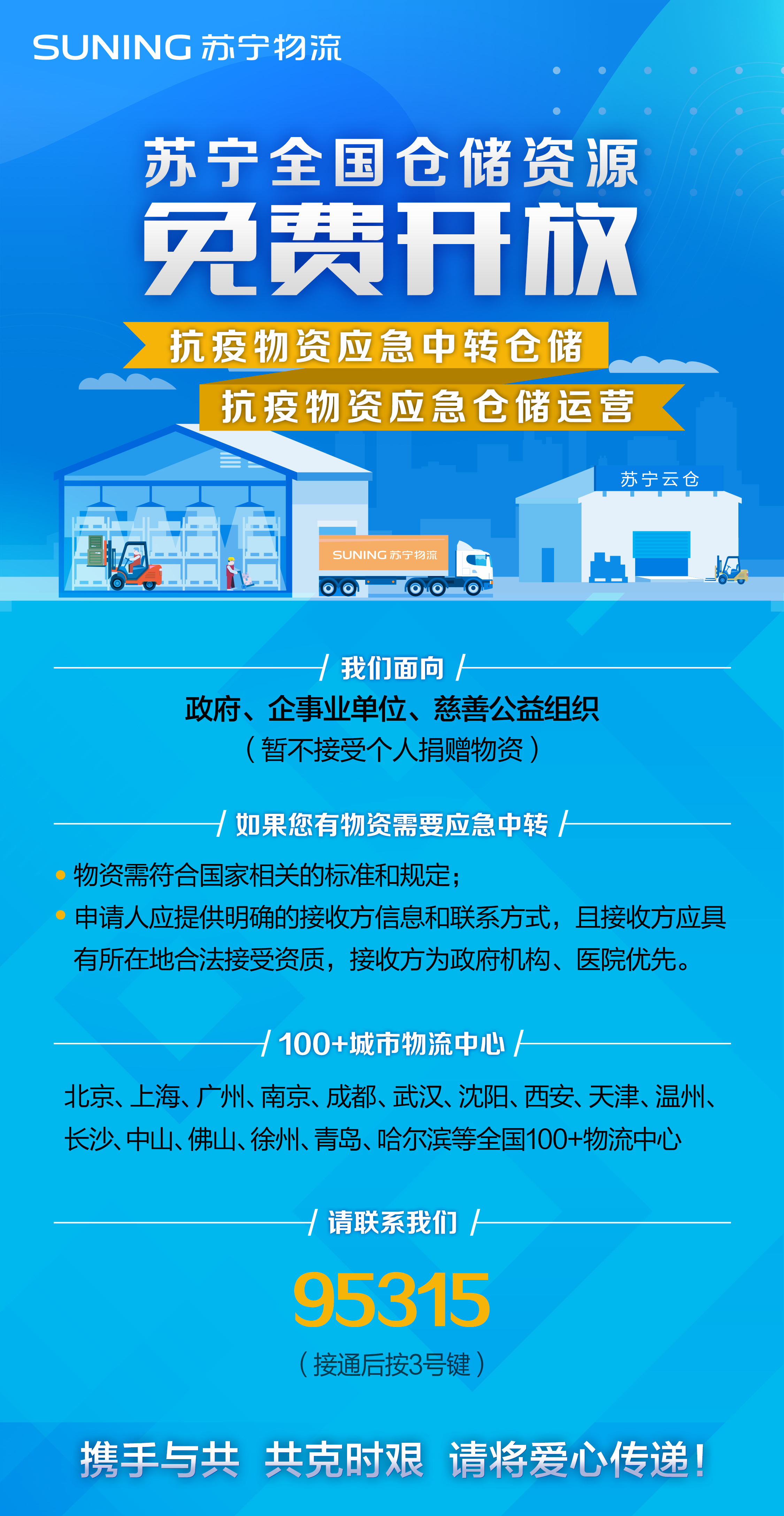 2月10日,蘇寧物流宣布,將面向政府、企事業(yè)單位、慈善公益組織免費開放全國倉儲資源,為抗疫物資提供應急中轉倉儲和應急倉儲運營服務。