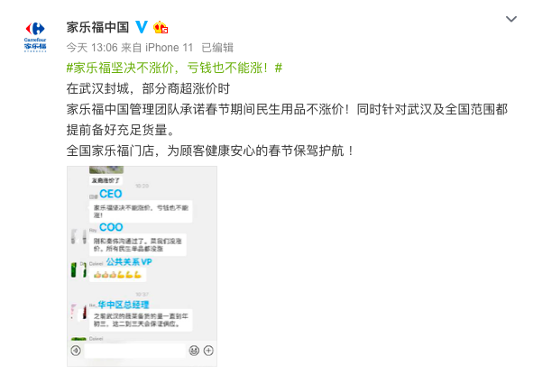家樂(lè)福中國(guó)官方微博發(fā)布了一條關(guān)于#家樂(lè)福堅(jiān)決不漲價(jià),虧錢(qián)也不能漲!#的微博表示,家樂(lè)福中國(guó)管理團(tuán)隊(duì)承諾春節(jié)期間民生用品不漲價(jià)。