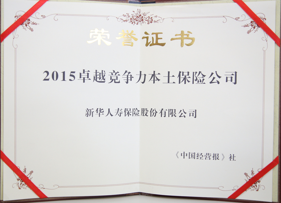2015年12月,在由中國經(jīng)營報主辦的2015年度(第七屆)卓越競爭力金融機(jī)構(gòu)評選中,新華保險獲得“2015卓越競爭力本土保險公司”獎。
