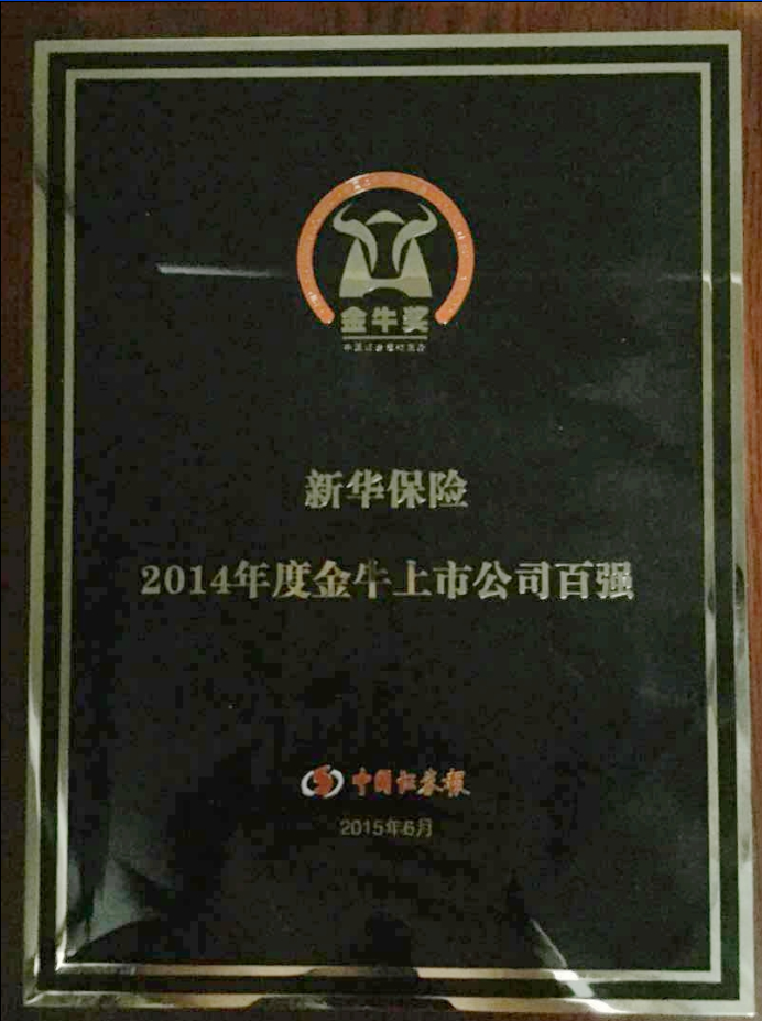 ?2015年6月,中國(guó)證券報(bào)第17屆(2014年度)上市公司金牛獎(jiǎng)隆重揭曉,新華保險(xiǎn)榮獲“金牛上市公司百強(qiáng)”獎(jiǎng)項(xiàng),這代表了資本市場(chǎng)以及社會(huì)各界對(duì)新華保險(xiǎn)在公司治理、信息披露、投資者關(guān)系等方面工作的高度認(rèn)可。