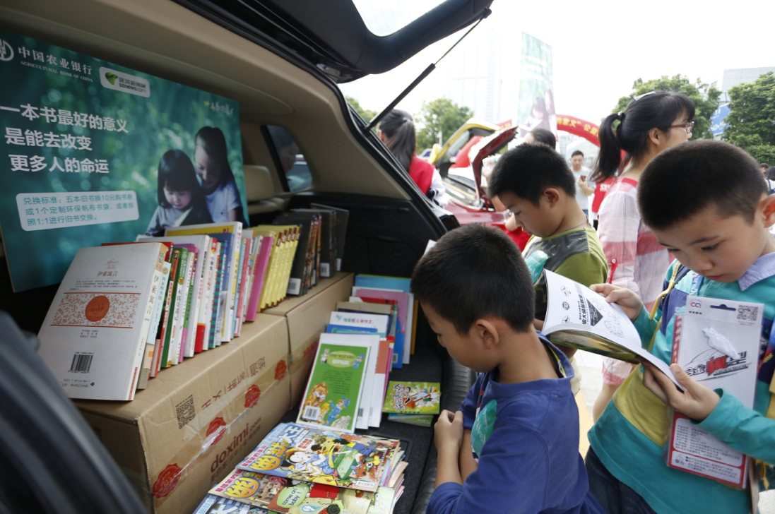 本次活動將車尾箱作為展臺,活動參與者按照1:1進行舊書交換,或到深圳農(nóng)行現(xiàn)場設(shè)置的捐書點捐獻舊書,每捐出五本舊書,可獲得由農(nóng)行送出的10元書劵。活動吸引來自錦田小學(xué)、深圳實驗學(xué)校中學(xué)部及深圳新聞網(wǎng)網(wǎng)友共40多個家庭參與,僅兩個小時便交出漂亮的“成績單”,現(xiàn)場交換圖書900多本,捐贈愛心書籍1000余本。