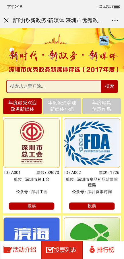 多個(gè)投票活動(dòng)已經(jīng)形成良好群眾效應(yīng),合作方主辦方多屆舉辦,每屆舉辦均由深圳新聞網(wǎng)負(fù)責(zé)投票系統(tǒng)開發(fā),例如:健康場所投票、集團(tuán)攝影大賽評選投票、政務(wù)類投票。形成了良好品牌效應(yīng)和示范,往往一個(gè)區(qū)舉辦的投票活動(dòng)其他區(qū)會跟進(jìn)舉辦,形成系列投票,例如:“最美護(hù)士”系列投票,“最美醫(yī)生”系列投票,“最美教師”系列投票,“最佳政務(wù)”系列投票等;