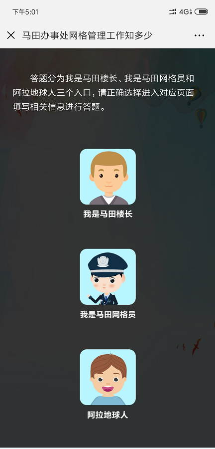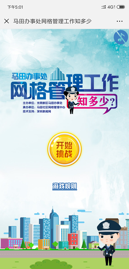 隨著當前光明新區(qū)經(jīng)濟和社會的飛速發(fā)展,網(wǎng)格巡查管理工作環(huán)境日趨復雜。為此,馬田辦事處以社區(qū)網(wǎng)格化為抓手,積極帶領業(yè)主、樓長、住戶主動參與到樓棟的管理和社區(qū)的建設,使他們從小“家”邁向大“家”,家家參與、人人行動,讓安全文明新風形成常態(tài),營造生機勃勃、欣欣向榮的社會氛圍,在馬田轄區(qū)打造共建共治共享社會治理格局?!榜R田辦事處網(wǎng)格管理工作知多少”線上有獎競答活動,由光明新區(qū)馬田辦事處主辦,馬田社區(qū)網(wǎng)格管理中心承辦。此次答題活動自8月15日9點啟動,截止至8月19日23點59分,為期5天。答題分為“我是網(wǎng)格員”入口、“我是樓長”入口和“阿拉地球人”三個入口。通過樓長入口進入的用戶,需輸入馬田轄區(qū)樓長身份證或港澳通行證號方可答題,網(wǎng)格員入口則需輸入馬田轄區(qū)網(wǎng)格員有效證件號碼進入對應的答題頁面。在每次答題時,答題系統(tǒng)將隨機抽取10道題,用戶須在120秒的時間內(nèi)完成,答對8題以上即視為闖關成功,可獲得一次抽獎機會,有機會獲得100元、50元、10元、5元、2元不等的微信紅包。