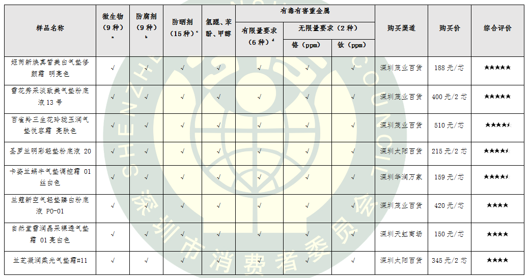 為給消費(fèi)者提供科學(xué)合理的消費(fèi)指引,深圳市消費(fèi)者委員會(huì)聯(lián)合福田區(qū)消費(fèi)者委員會(huì)、寶安區(qū)消費(fèi)者委員會(huì)委托深圳市品質(zhì)消費(fèi)研究院開展氣墊粉底比較試驗(yàn)。本次比較試驗(yàn)委托第三方權(quán)威檢測(cè)機(jī)構(gòu)進(jìn)行檢測(cè),對(duì)國(guó)內(nèi)外8個(gè)知名品牌氣墊粉底的安全性和感官性進(jìn)行了比拼。