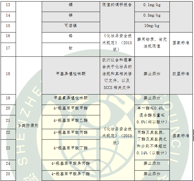 b.防腐劑 (9種):甲基異噻唑啉酮、甲基氯異噻唑啉酮、4-羥基苯甲酸甲酯、4-羥基苯甲酸乙酯、4-羥基苯甲酸丙酯、4-羥基苯甲酸丁酯、4-羥基苯甲酸異丙酯、4-羥基苯甲酸異丁酯、甲醛