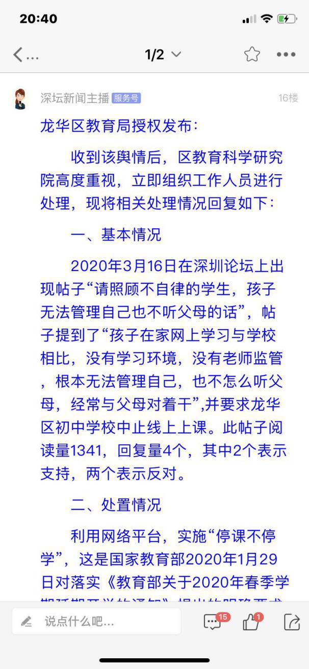 3月23日,針對市民的問題,龍華區(qū)教育局通過深圳論壇進行了公開回應(yīng),利用網(wǎng)絡(luò)平臺,實施“停課不停學(xué)”,這是國家教育部2020年1月29日對落實《教育部關(guān)于2020年春季學(xué)期延期開學(xué)的通知》提出的明確要求與重要舉措。義務(wù)教育學(xué)段在線教學(xué)開課時間擬定從2月17日起至3月17日,具體線下課堂上課時間,以市教育局通知復(fù)課時間為準。我區(qū)義務(wù)教育階段實施在線教學(xué)也是從2月17日開始,直到接到上級通知復(fù)課的文件為止。而現(xiàn)階段仍沒接到相關(guān)停止線上教學(xué)的文件通知。