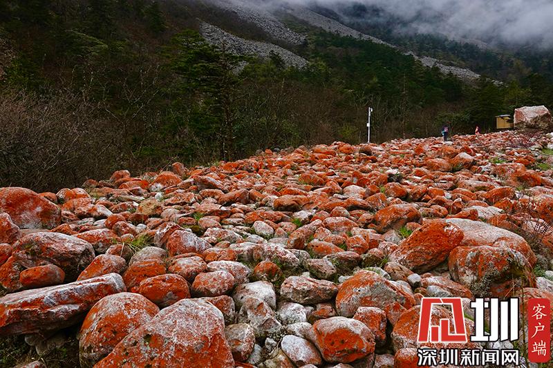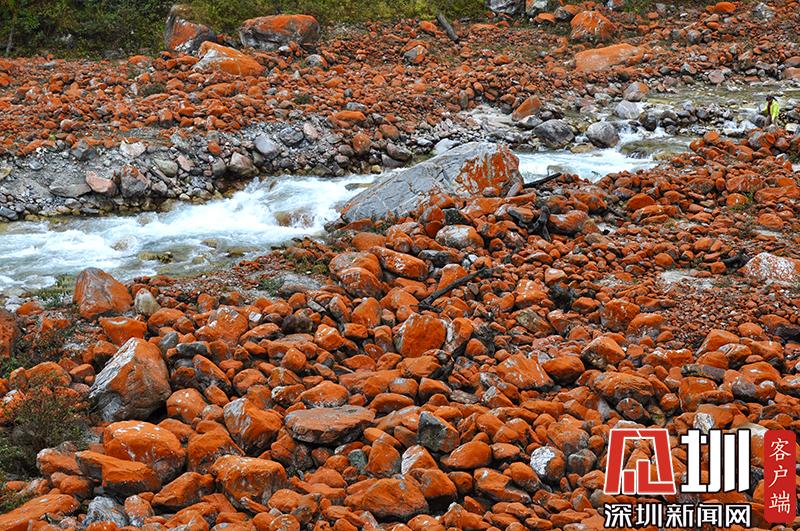 紅石對生長環(huán)境的要求極為苛刻,空氣潔凈度、濕度、水的清潔度都會影響它們的生長。雅家梗一代低碳富氧的空氣、冰山融雪的溪流、森林茂密的植被,為紅石的生長繁衍提供了最理想的環(huán)境。在這里,紅石密布于近百米寬的河谷里,不同的季節(jié),不同的天氣狀況下,幻化出不同的色彩,呈現(xiàn)朝紅夕褚的奇異景觀。