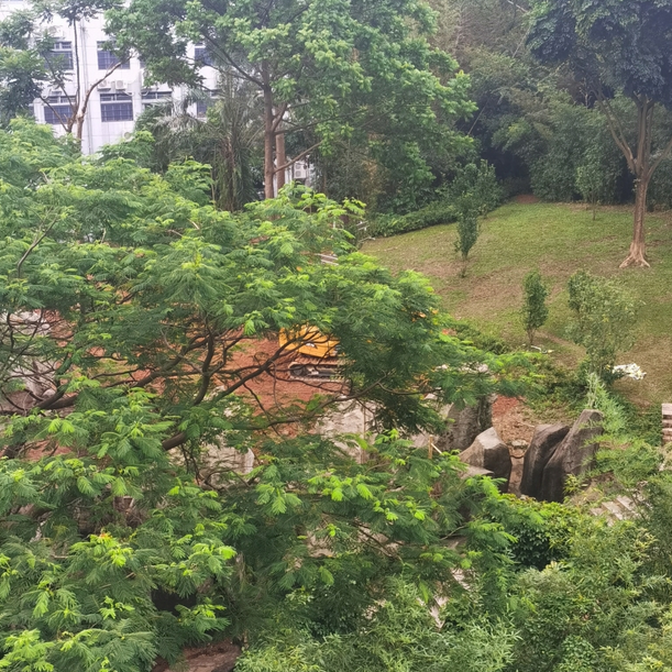 其次,從今年7月起,在二層架高平臺(tái)之上的山坡綠地,存在樹木砍伐和綠地草坪遭毀壞的情況,且有挖掘機(jī)開入并停泊,而現(xiàn)場也沒有任何工程信息和告示。
