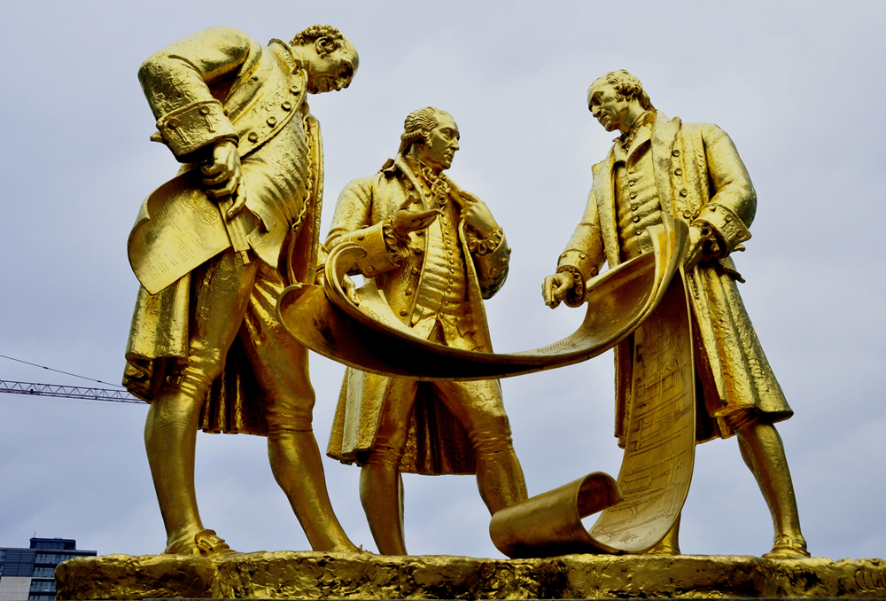 伯明翰是工業(yè)革命的發(fā)源地,市區(qū)會(huì)展中心對(duì)面有一座代表城市形象的雕塑作品,三個(gè)鎦金人物的塑像并肩佇立,正在討論問(wèn)題,其金燦燦外表十分搶眼。這三個(gè)塑像是英國(guó)工業(yè)革命時(shí)期的杰出人物,蒸汽機(jī)的發(fā)明和制造者瓦特,蒸汽機(jī)和煤氣街燈的發(fā)明者默克多,工業(yè)家和機(jī)械制造商馬修·博爾頓。李仁奇 攝