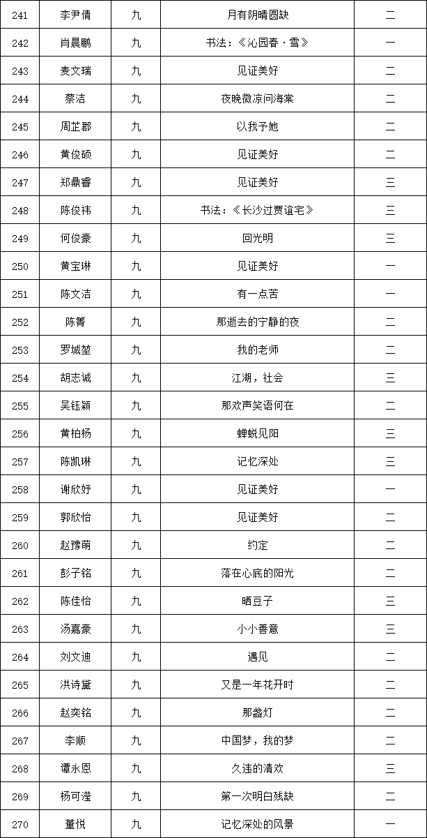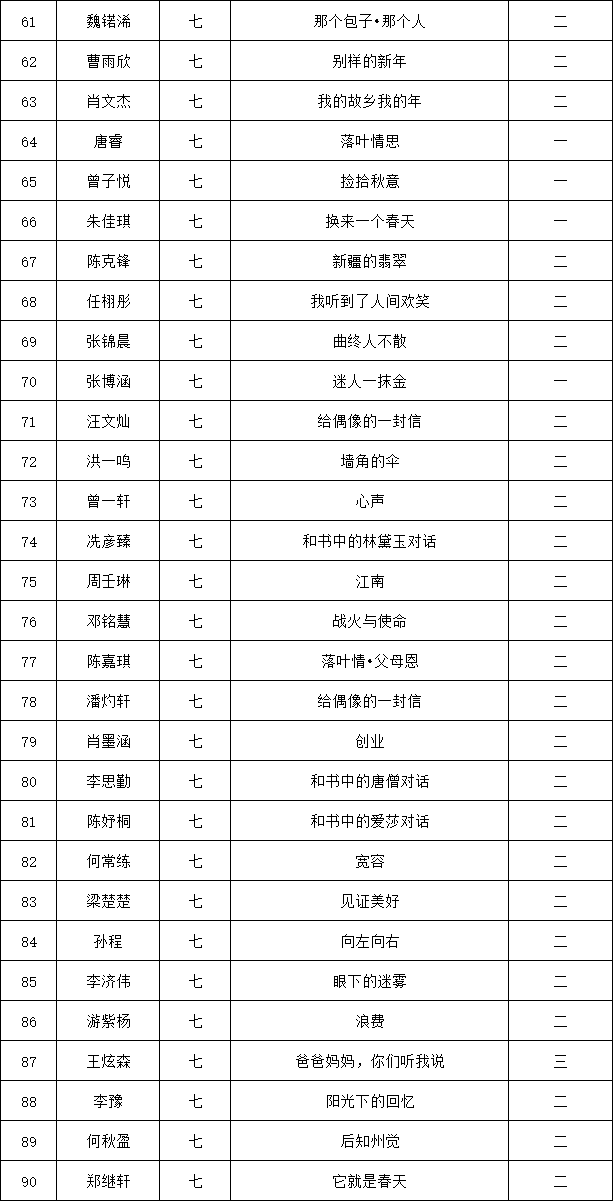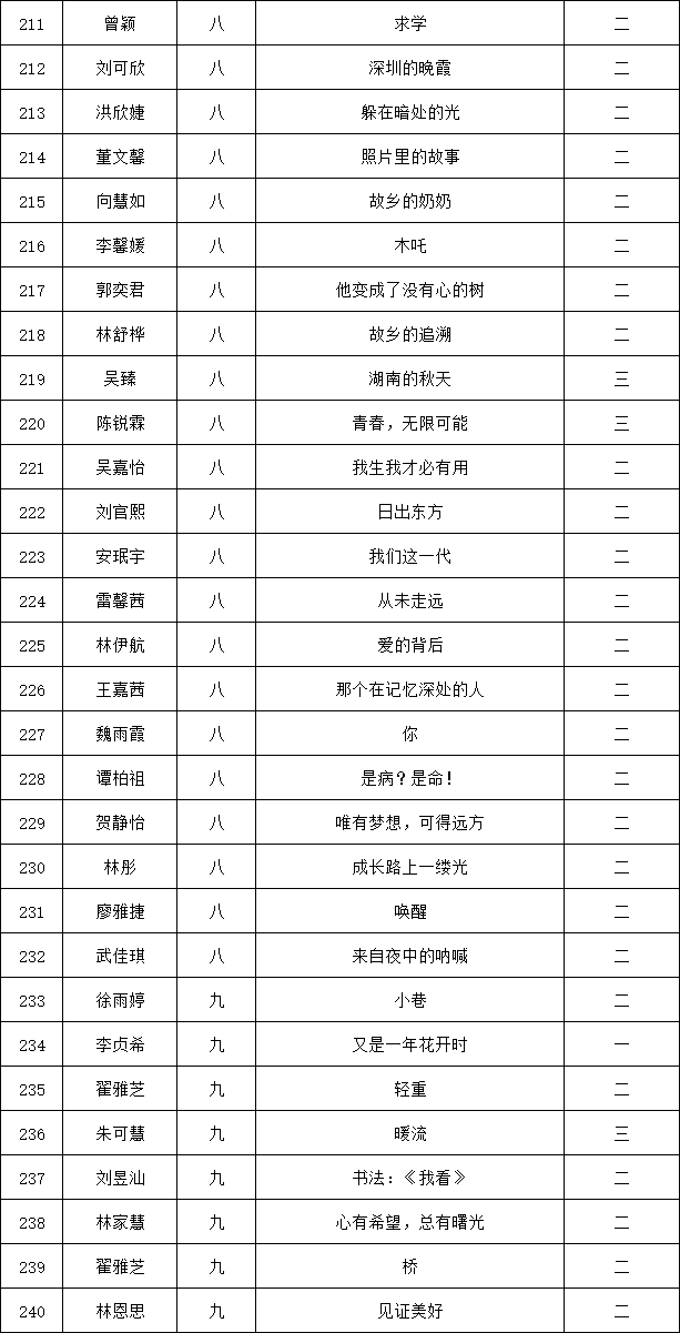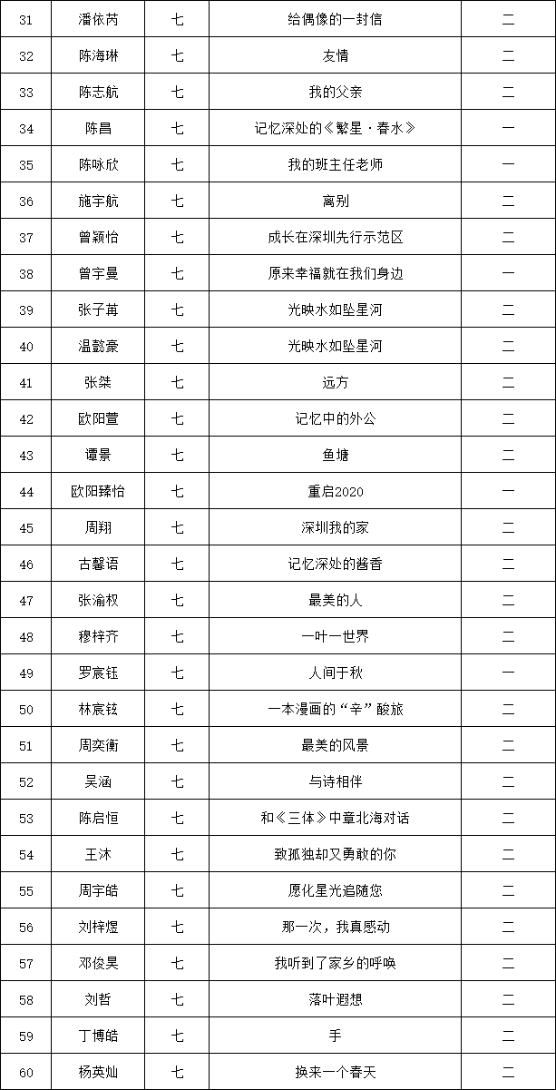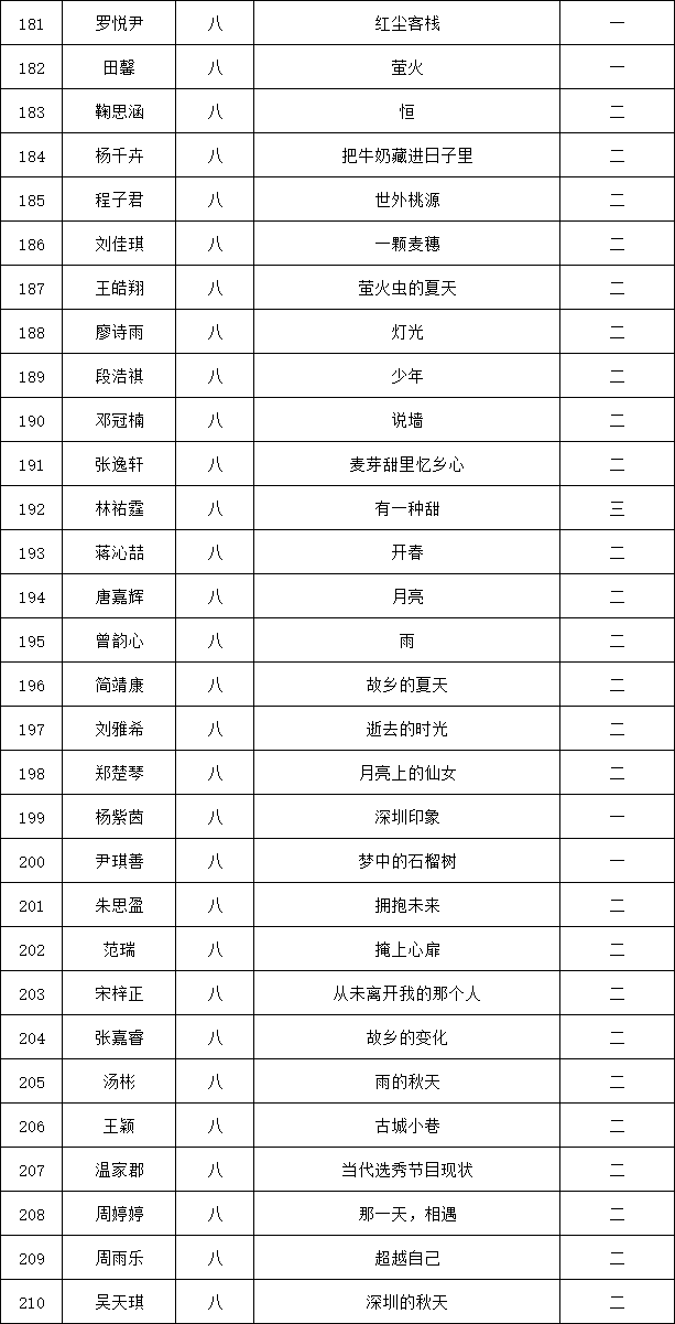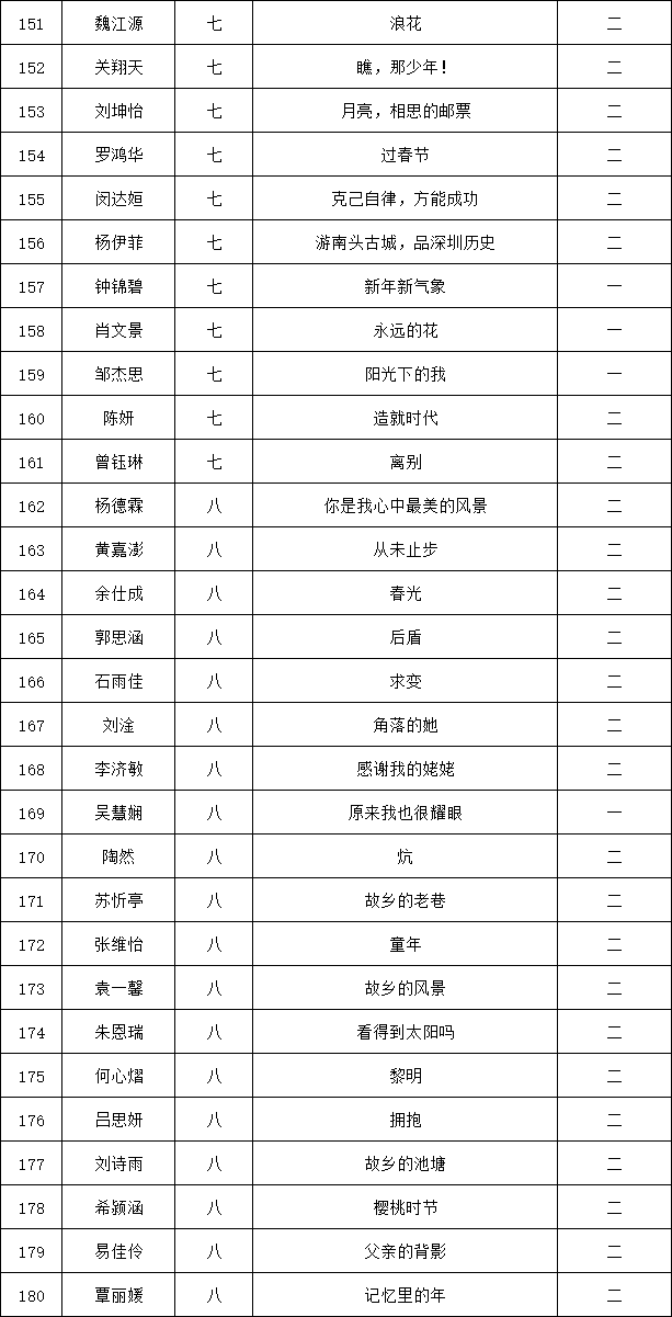 自2021年1月,活動征稿啟動以來,獲得了深圳市廣大中小學(xué)生、教師、文學(xué)愛好者的熱烈響應(yīng)積極參與,吸引了深圳百余所學(xué)校的上萬人關(guān)注報名。現(xiàn)公布龍華區(qū)外國語學(xué)校專場晉級復(fù)賽名單如下: