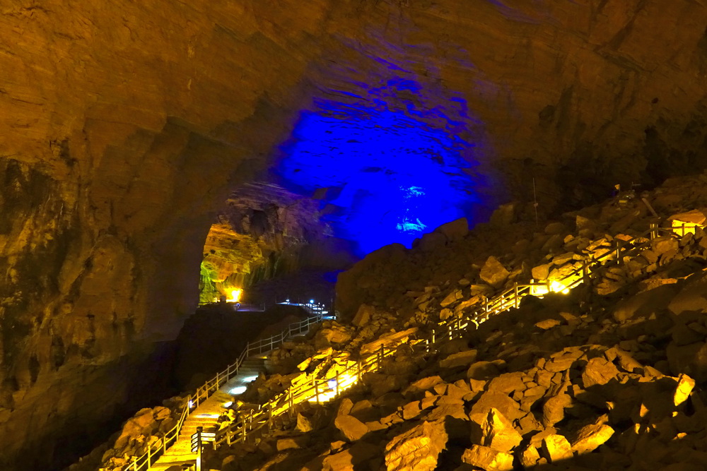 旱洞里現(xiàn)在有兩個劇場,有定時的激光和歌舞表演。水洞里有地下瀑布10余處。李仁奇 攝