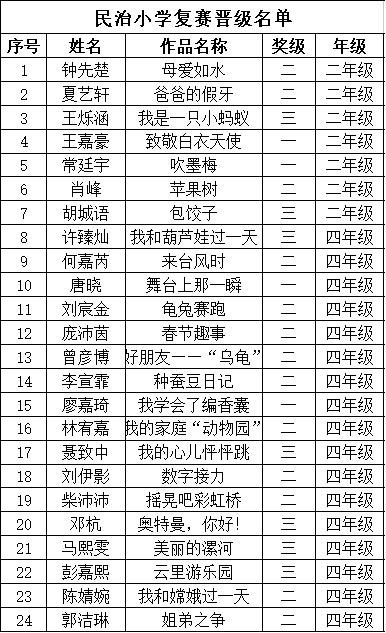 自2021年1月,活動征稿啟動以來,獲得了深圳市廣大中小學(xué)生、教師、文學(xué)愛好者的熱烈響應(yīng)積極參與,吸引了深圳百余所學(xué)校的上萬人關(guān)注報名?,F(xiàn)公布龍華區(qū)民治小學(xué)晉級復(fù)賽名單如下: