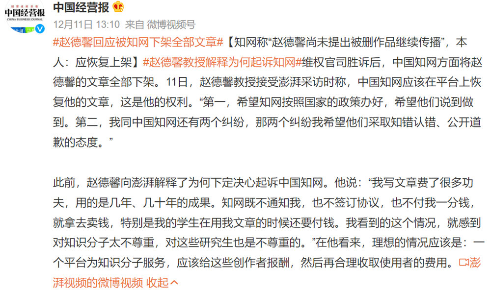 12月10日,中國知網(wǎng)向趙德鑫教授道歉,表示將妥當處理趙德鑫教授作品繼續(xù)在知網(wǎng)平臺傳播的問題。道歉中提到,2016年起,中國知網(wǎng)向全社會免費開放八年前出版的文獻,未來將進一步免費開放更多的學術資源。2019年起,所有在中國知網(wǎng)實名注冊的作者,可無限期免費使用自己的作品,管理自己的學術成果,并隨時跟蹤其研究成果的學術影響。