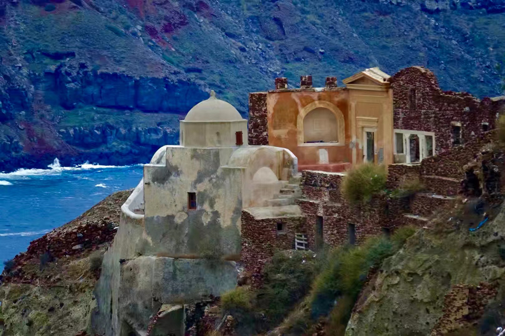 費(fèi)拉碼頭附近有許多懸崖,無(wú)數(shù)的白色小屋依山而建,與天空、海洋混成一體,這是地中海獨(dú)有的景觀。李仁奇 攝