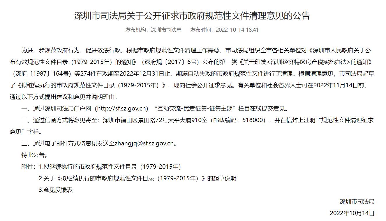 讀特客戶端·深圳新聞網(wǎng)2022年10月20日訊(記者 翁任瑩)近日,深圳市司法局就《擬繼續(xù)執(zhí)行的市政府規(guī)范性文件目錄(1979-2015年)》向社會(huì)公開征求意見,擬對274件有效期至2022年12月31日止、期滿自動(dòng)失效的市政府規(guī)范性文件進(jìn)行清理。