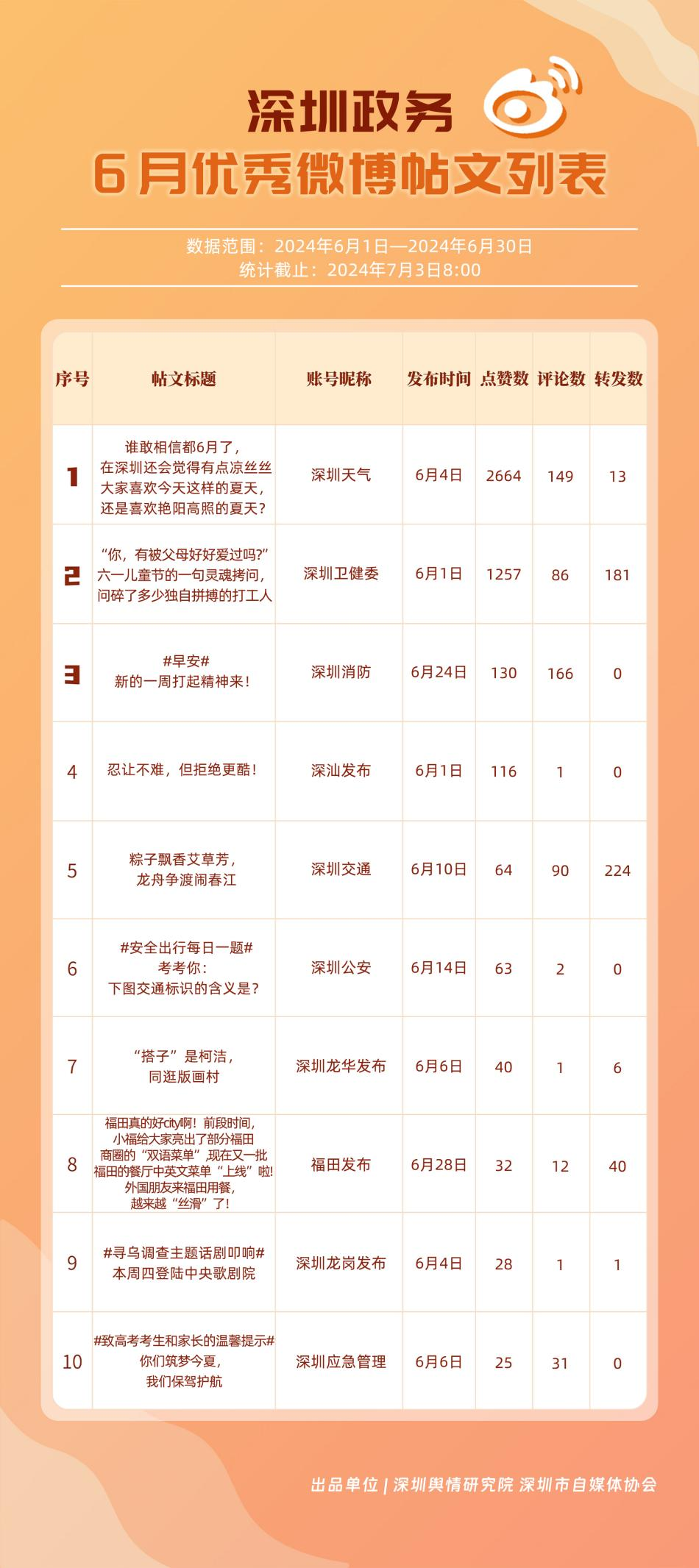 6月,“深圳天氣”“深圳衛(wèi)健委”“深圳消防”“福田發(fā)布”“深圳公安”“深圳應(yīng)急管理”“深圳交通”“深圳市城市管理和綜合執(zhí)法局”“深圳交警”“深圳龍崗發(fā)布”等20個政務(wù)微博號入列“優(yōu)秀”名單。“深圳天氣”“深圳衛(wèi)健委”“深圳消防”等賬號抓住微博平臺的傳播特征,持續(xù)輸出優(yōu)質(zhì)內(nèi)容,滿足受眾需求,不斷提高用戶體驗和傳播效果。