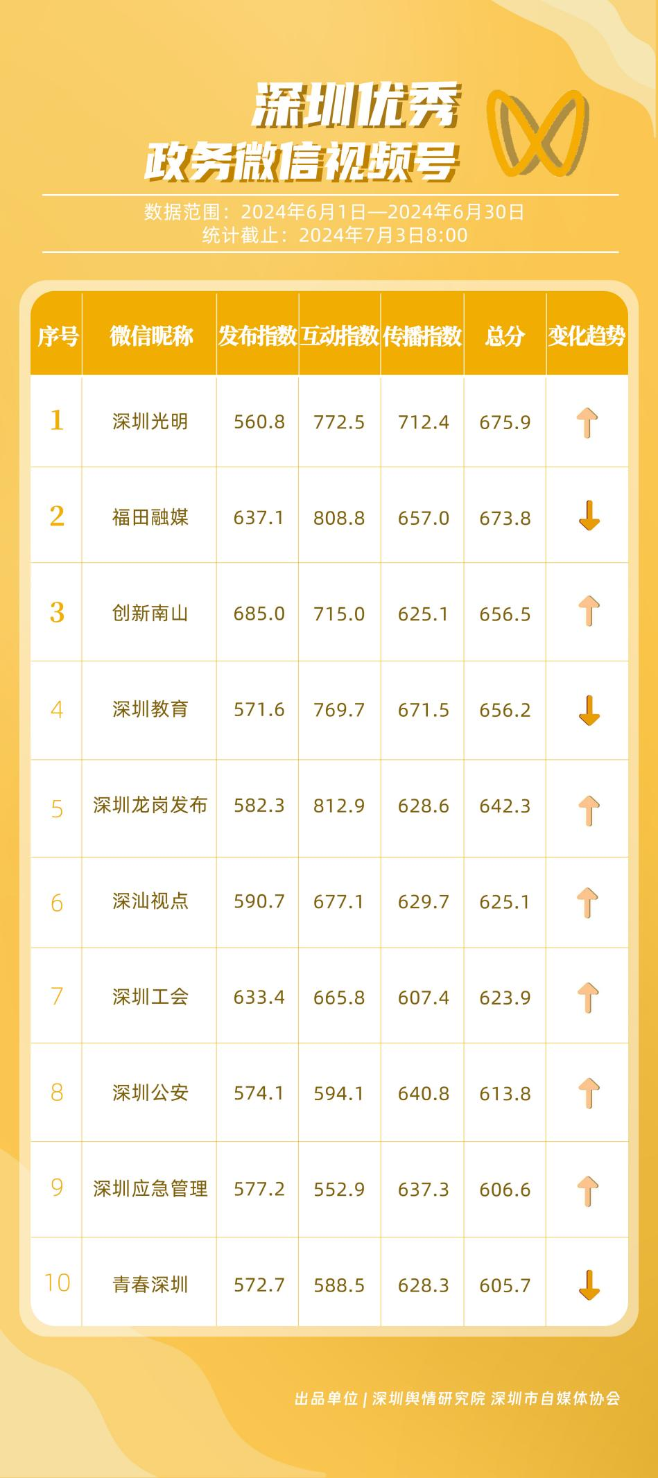 榜單在持續(xù)展示深圳政務(wù)新媒體矩陣建設(shè)成效的同時,梳理總結(jié)了深圳政務(wù)微信公眾號、微信視頻號、微博號、抖音號、頭條號的運(yùn)營方法與經(jīng)驗,是政務(wù)公開、回應(yīng)群眾關(guān)切的重要載體。6月,又有哪些政務(wù)新媒體取得優(yōu)異成績呢?《深圳優(yōu)秀政務(wù)新媒體矩陣》(2024年6月期)邀您共同關(guān)注。