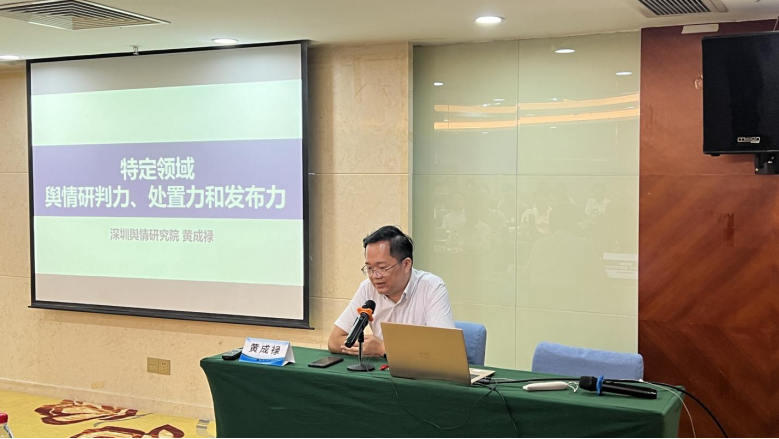 深圳新聞網(wǎng)2024年8月2日訊(記者 蔡雪曼 實習生 謝臻兒)為提高全市特定領域人員輿情工作素養(yǎng),深化輿情意識和認知,助力營造良好的輿論氛圍,7月25日下午,某市直單位舉辦專題培訓班,邀請深圳輿情研究院執(zhí)行院長黃成祿擔任授課老師,圍繞《特定領域輿情研判力、處置力和發(fā)布力》主題展開授課。