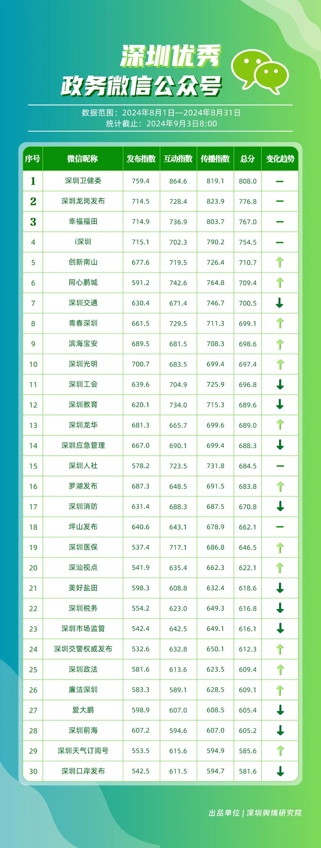 8月,“深圳衛(wèi)健委”“深圳龍崗發(fā)布”“幸福福田”“i深圳”“創(chuàng)新南山”“同心鵬城”“深圳交通”“青春深圳”“濱海寶安”“深圳光明”等30個(gè)賬號(hào)入選“深圳優(yōu)秀政務(wù)微信公眾號(hào)”。其中,榜單前四名的“深圳衛(wèi)健委”“深圳龍崗發(fā)布”“幸福福田”“i深圳”以其高質(zhì)量的內(nèi)容和有效的信息傳播策略,持續(xù)獲得公眾較高關(guān)注度,排名未產(chǎn)生變動(dòng)。緊隨其后的“創(chuàng)新南山”“同心鵬城”“深圳交通”等賬號(hào)也在內(nèi)容風(fēng)格、質(zhì)量等方面展現(xiàn)了非凡的實(shí)力,獲得了積極反響。