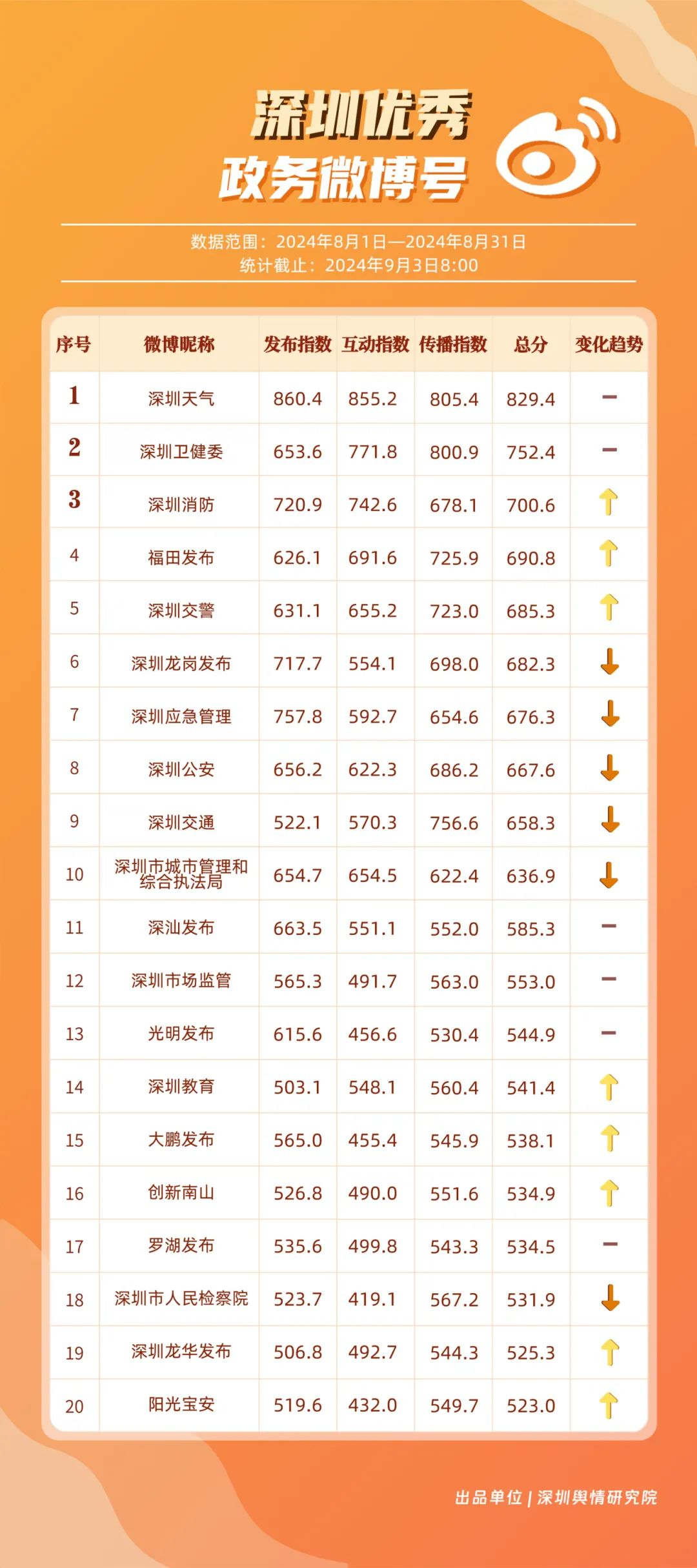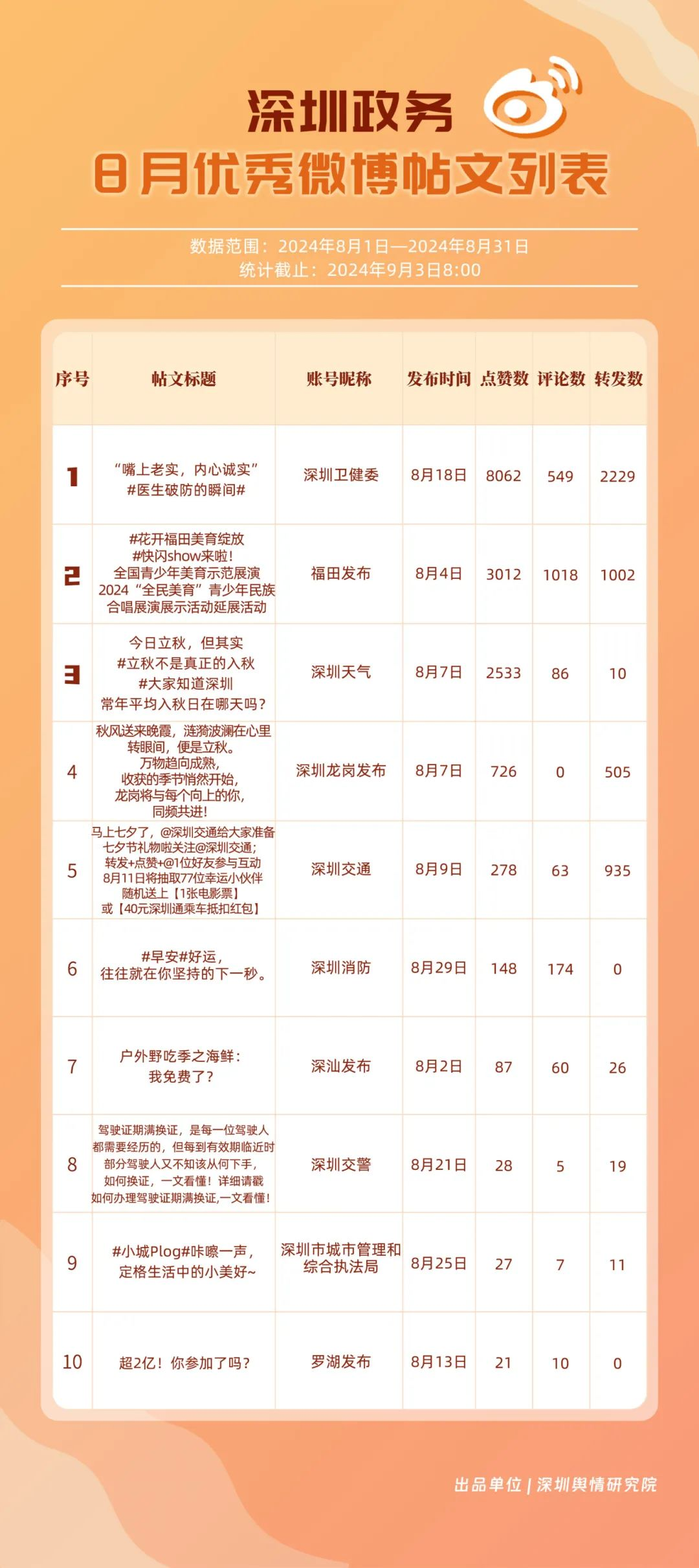 8月,“深圳天氣”“深圳衛(wèi)健委”“深圳消防”“福田發(fā)布”“深圳交警”“深圳龍崗發(fā)布”“深圳應(yīng)急管理”“深圳公安”“深圳交通”“深圳市城市管理和綜合執(zhí)法局”等20個(gè)政務(wù)微博號(hào)發(fā)布高質(zhì)量信息,入選優(yōu)秀政務(wù)微博號(hào)。其中,“深圳天氣”“深圳衛(wèi)健委”持續(xù)保持領(lǐng)先地位;“深圳消防”“福田發(fā)布”“深圳交警”等賬號(hào)有效優(yōu)化發(fā)布內(nèi)容和互動(dòng)策略,排名有所提升。