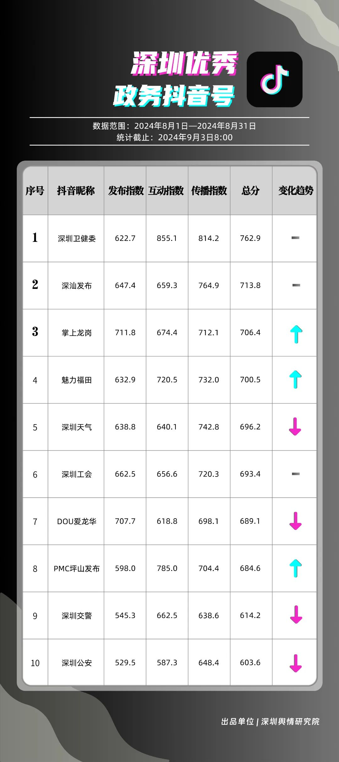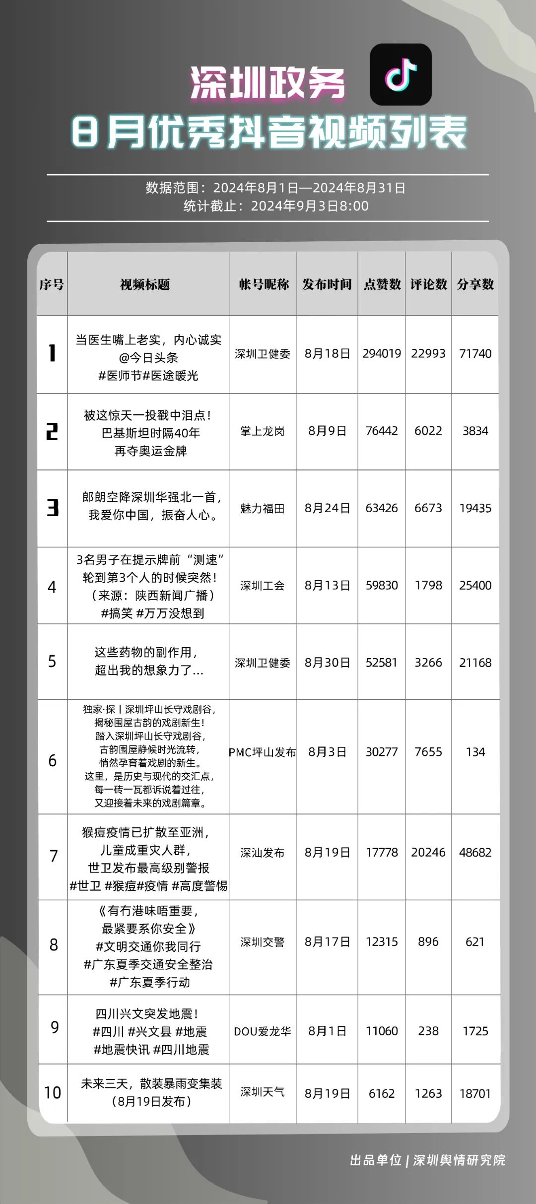 8月,“深圳衛(wèi)健委”“深汕發(fā)布”“掌上龍崗”“魅力福田”“深圳天氣”“深圳工會(huì)”“DOU愛龍華”“PMC坪山發(fā)布”“深圳交警”和“深圳公安”共10個(gè)政務(wù)抖音號(hào)獲得優(yōu)秀稱號(hào),“深圳衛(wèi)健委”“深汕發(fā)布”“掌上龍崗”以高分居榜單前三,賬號(hào)有關(guān)“醫(yī)師節(jié)”“猴痘”“奧運(yùn)金牌”的視頻獲得了較高的關(guān)注度和討論度,相關(guān)優(yōu)秀視頻在傳播信息的同時(shí),也展現(xiàn)了深圳政務(wù)抖音號(hào)在內(nèi)容質(zhì)量、互動(dòng)性和傳播度方面的實(shí)力。