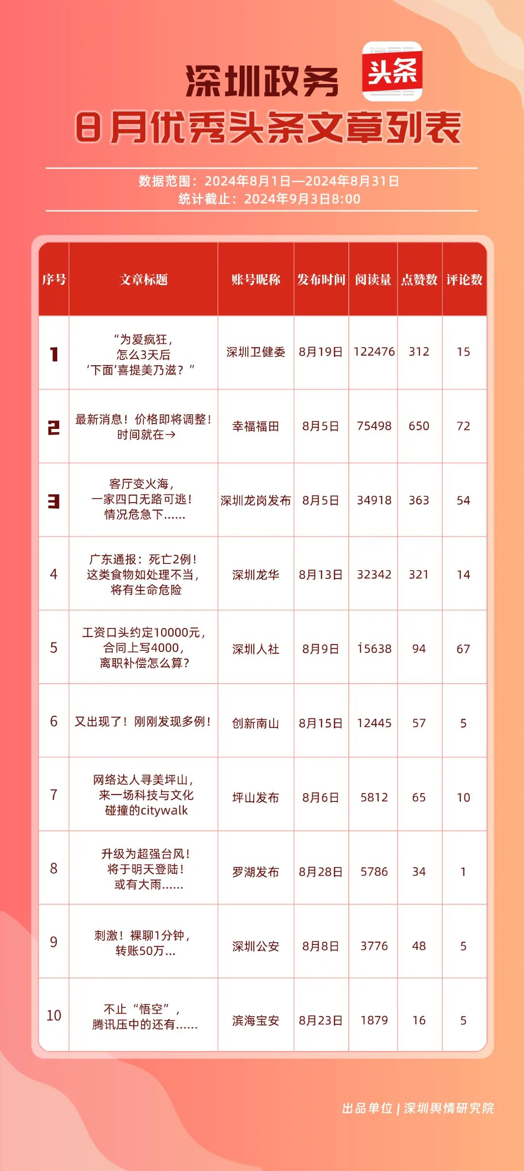 8月,“幸福福田”“深圳龍崗發(fā)布”“深圳衛(wèi)健委”“深圳龍華”“創(chuàng)新南山”“深圳人社”“深圳光明”“羅湖發(fā)布”“濱海寶安”和“坪山發(fā)布”共10個(gè)政務(wù)頭條號(hào)入選榜單。相關(guān)賬號(hào)的文章《“為愛瘋狂,怎么3天后‘下面’喜提美乃滋?”》《最新消息!價(jià)格即將調(diào)整!時(shí)間就在→》等貼近民生,傳遞實(shí)用信息,收獲了較高的閱讀量和點(diǎn)贊數(shù)。