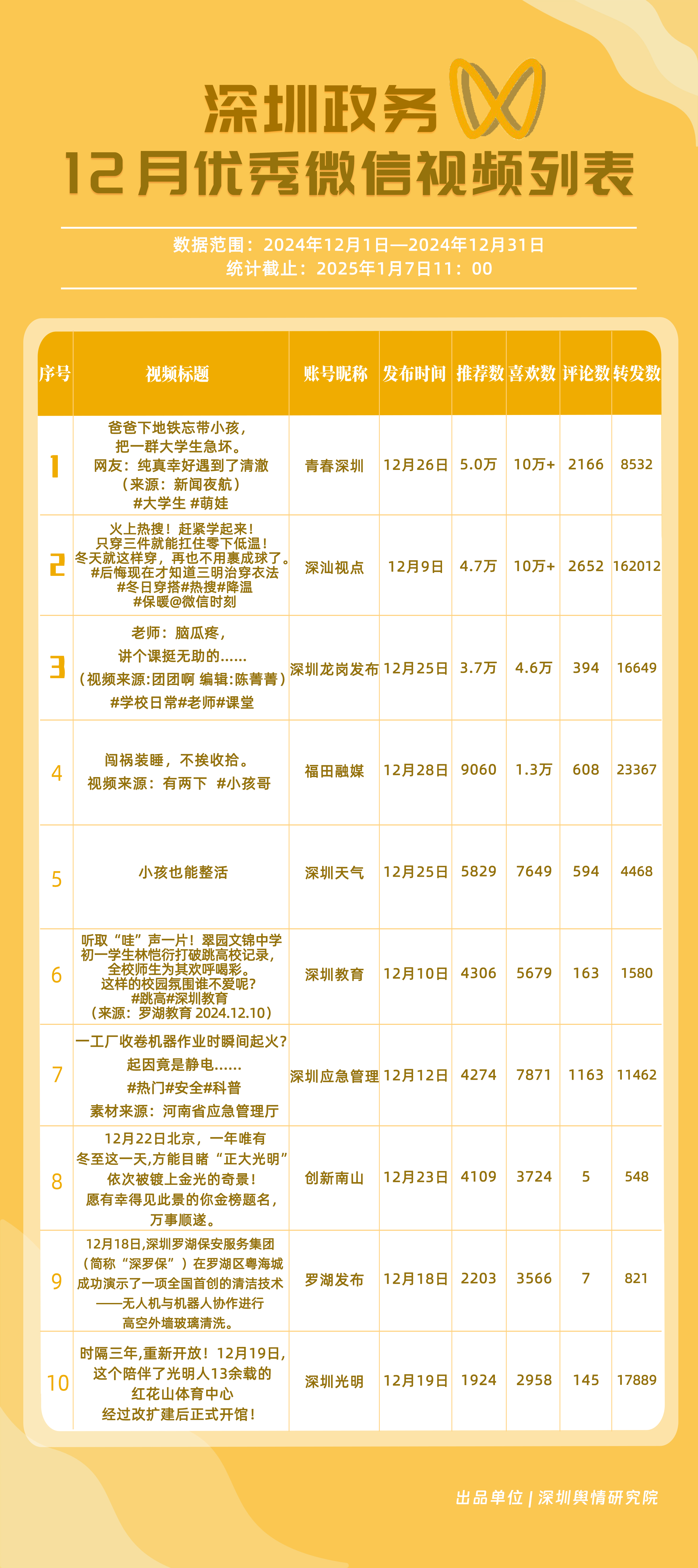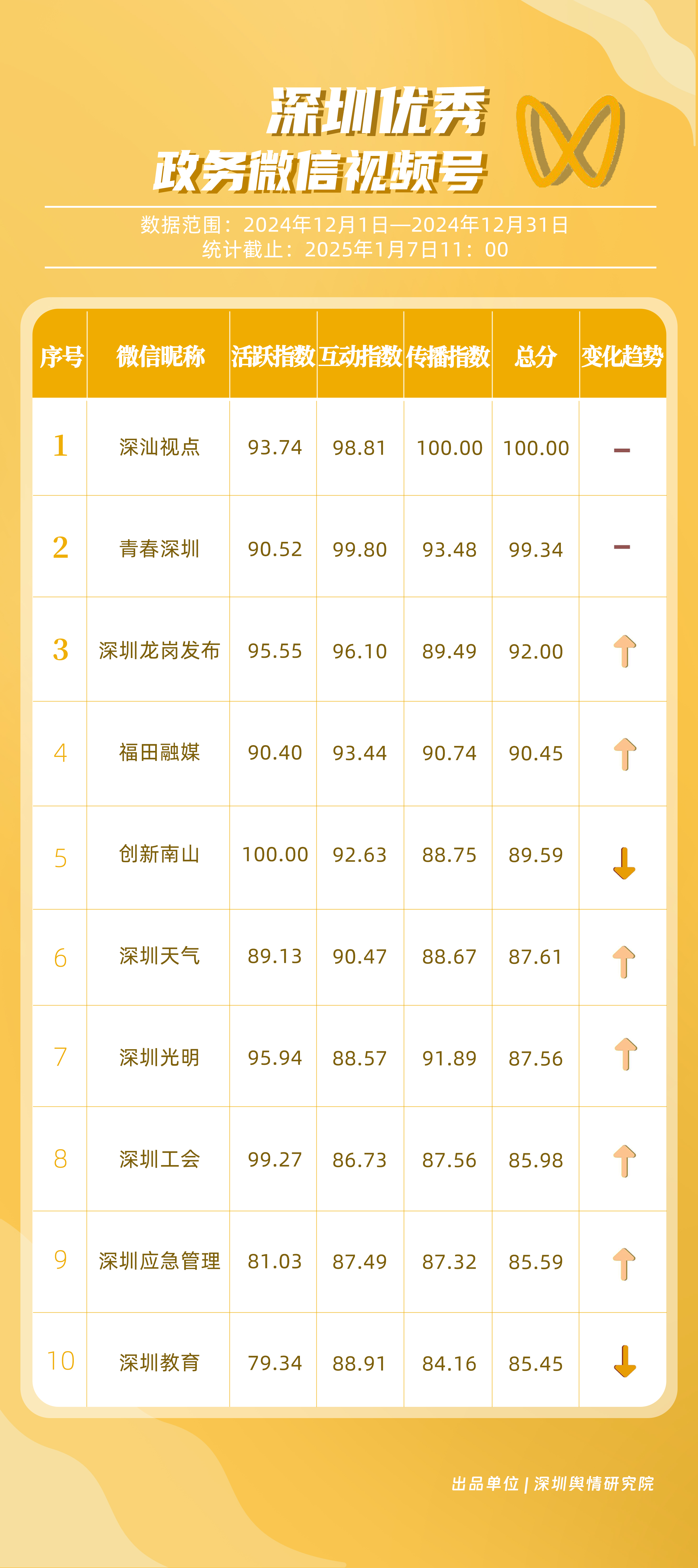 12月,獲“深圳優(yōu)秀政務微信視頻號”稱號的分別是“深汕視點”“青春深圳”“深圳龍崗發(fā)布”“福田融媒”“創(chuàng)新南山”“深圳天氣”“深圳光明”“深圳工會”“深圳應急管理”“深圳教育”。其中,“深汕視點”“青春深圳”在互動方面表現(xiàn)突出,占據(jù)榜單第一、第二位置。“深圳龍崗發(fā)布”活躍、互動指數(shù)位于各政務視頻號前列,排名有所提升?!案L锶诿健比笾笜说梅志?0分以上,位于榜單第四名,充分展現(xiàn)各政務微信視頻號在信息更新、用戶互動以及傳播范圍等方面的卓越能力和持續(xù)進步。