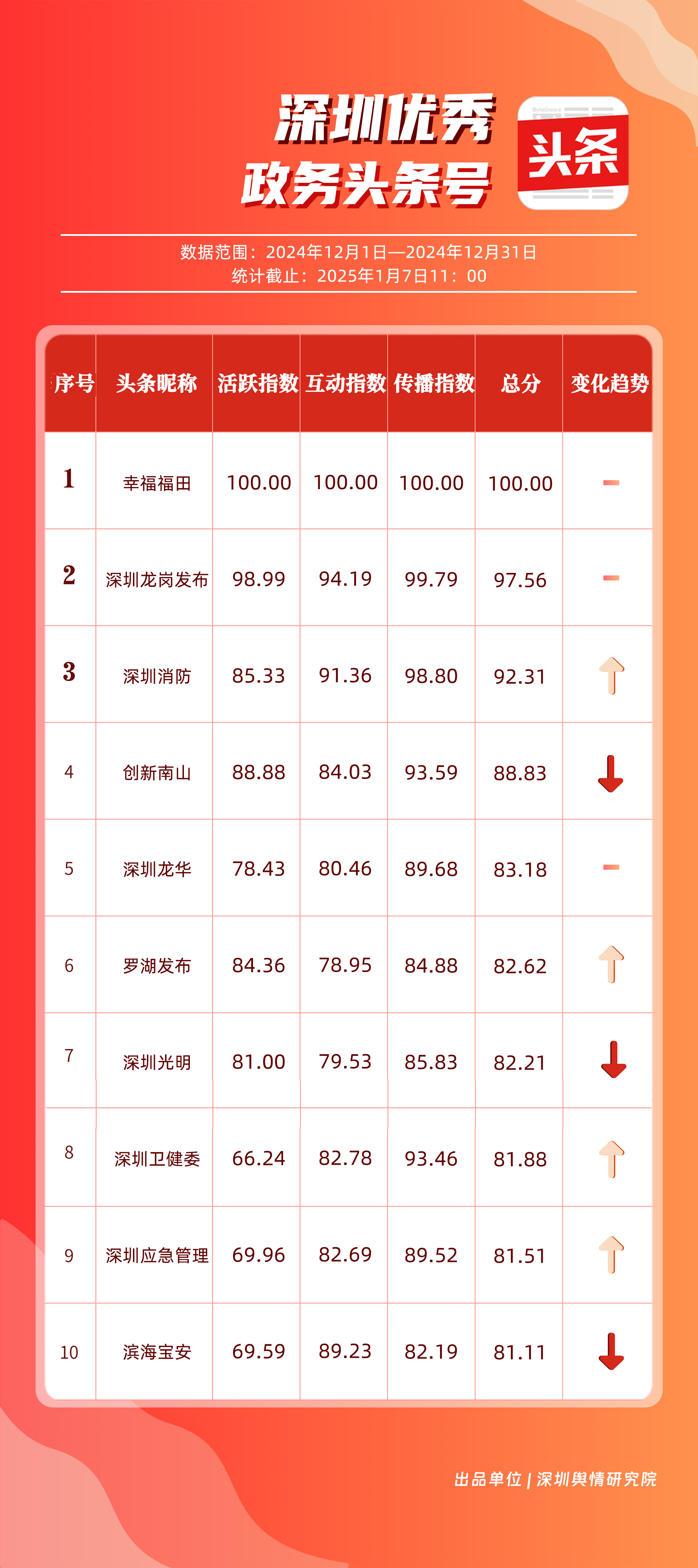 12月,“幸福福田”“深圳龍崗發(fā)布”“深圳消防”“創(chuàng)新南山”“深圳龍華”“羅湖發(fā)布”“深圳光明”“深圳衛(wèi)健委”“深圳應急管理”“濱海寶安”共10個政務頭條號入選“優(yōu)秀政務頭條號”榜單。對比其他賬號,“幸福福田”在各方面均取得較好成績,居于榜單第一位置?!吧钲邶垗彴l(fā)布”以97.56分位于榜單第二名,其傳播指數(shù)得分為99.79分,反映出賬號在信息傳播范圍方面存在明顯優(yōu)勢。此外,賬號“深圳消防”“創(chuàng)新南山”“深圳龍華”也為市民提供便捷、高效的政務信息,位于榜單前五名。