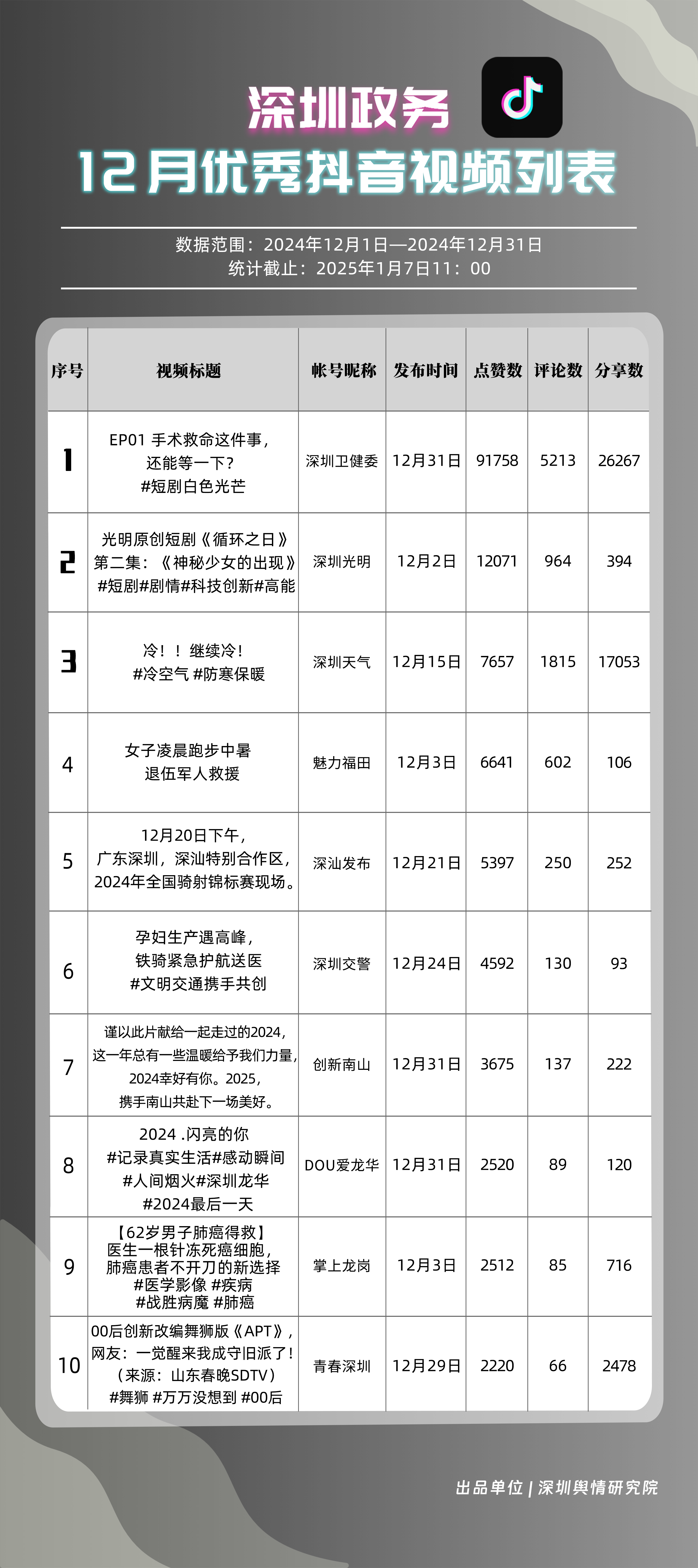 12月,“深圳衛(wèi)健委”“深圳天氣”“深汕發(fā)布”“掌上龍崗”“深圳光明”“DOU愛龍華”“魅力福田”“青春深圳”“深圳交警”“深圳工會”共10個政務抖音號獲得“深圳優(yōu)秀政務抖音號”稱號。“深圳衛(wèi)健委”在互動、傳播方面成績優(yōu)異,助推其位于榜單首位。“深圳天氣”“深汕發(fā)布”“掌上龍崗”則各有所長,綜合排名位于榜單前列,內(nèi)容產(chǎn)出豐富、用戶互動高頻,信息傳播廣泛,共同展現(xiàn)了政務抖音號在服務公眾、提升信息傳播效能方面的顯著效能。