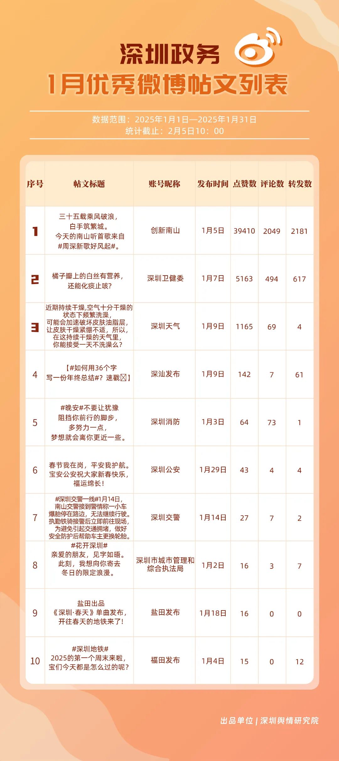 2025年1月期《深圳優(yōu)秀政務(wù)新媒體矩陣》發(fā)布,一同揭曉哪些政務(wù)新媒體矩陣能夠憑借其卓越表現(xiàn)脫穎而出,成為推動政務(wù)信息傳播與服務(wù)模式創(chuàng)新的領(lǐng)航者,引領(lǐng)政務(wù)新媒體運營邁向新高度。