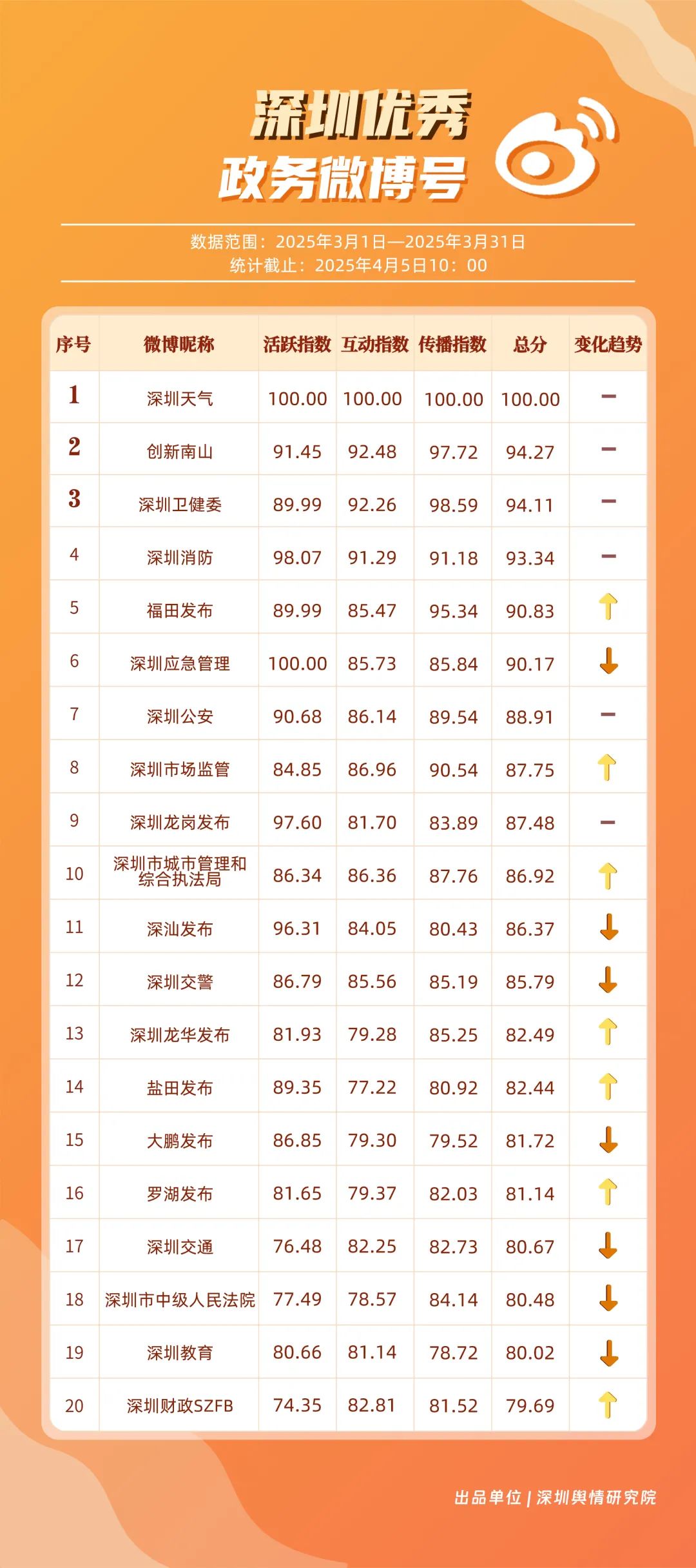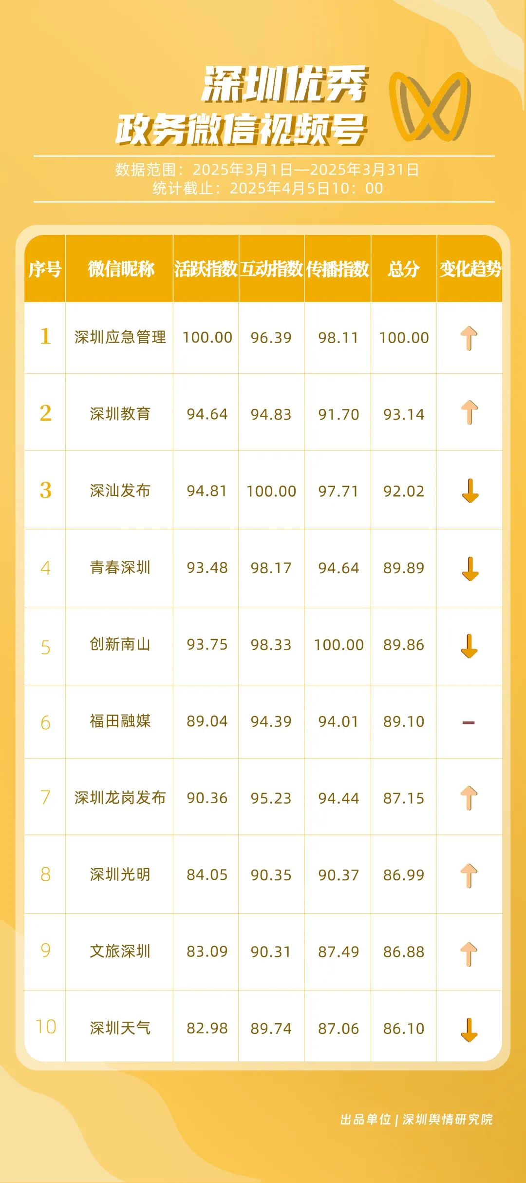 3月,市衛(wèi)生健康委、龍崗區(qū)、市氣象局、深汕特別合作區(qū)、南山區(qū)、福田區(qū)、市應急管理局、龍華區(qū)、寶安區(qū)、光明區(qū)榮登“深圳優(yōu)秀政務新媒體矩陣”榜單。3月,市衛(wèi)生健康委新媒體矩陣持續(xù)關注市民身心健康,發(fā)布健康科普內(nèi)容,穩(wěn)居榜單第一位;龍崗區(qū)新媒體矩陣在抖音、微信視頻號平臺發(fā)力宣傳,躍居榜單第二位;市氣象局新媒體矩陣在微博平臺連續(xù)多期獲得滿分,持續(xù)以氣象預警與生活指南結(jié)合的內(nèi)容模式,為市民帶來便利信息。以上賬號在“深圳優(yōu)秀政務新媒體矩陣”榜單中榮獲前三名。此外,深汕特別合作區(qū)新媒體矩陣積極發(fā)布網(wǎng)絡熱點內(nèi)容,收獲較多網(wǎng)民關注分享;南山區(qū)新媒體矩陣多平臺實力強勁,以88.37分居于榜單第五位。值得關注的是,寶安區(qū)新媒體矩陣時隔多期躋身榜單前十名,多平臺均衡發(fā)展成效初顯。