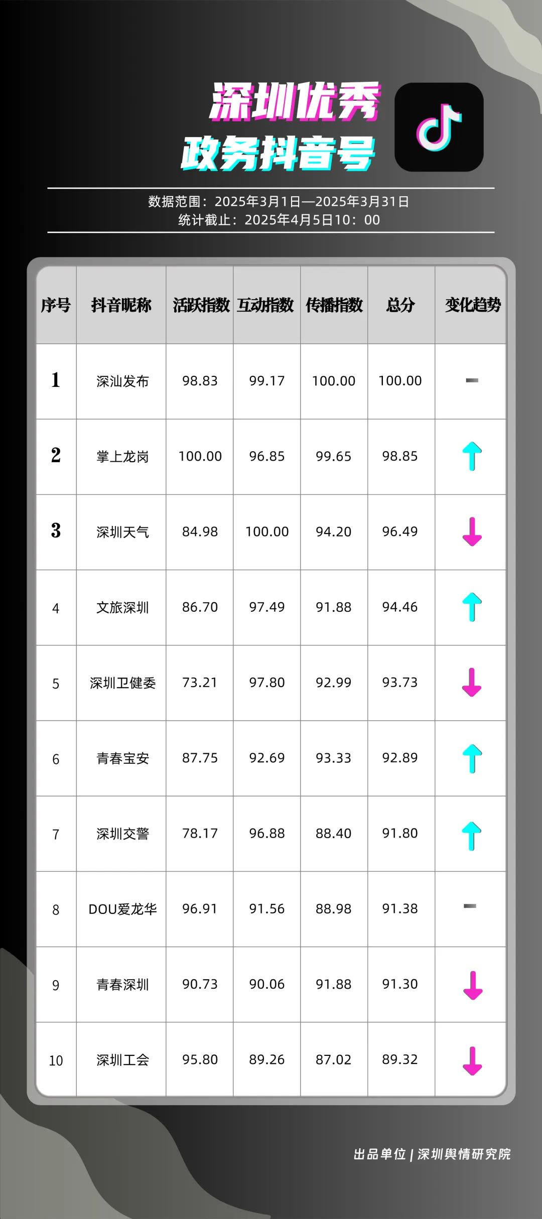 3月,“深汕發(fā)布”“掌上龍崗”“深圳天氣”“文旅深圳”“深圳衛(wèi)健委”“青春寶安”“深圳交警”“DOU愛龍華”“青春深圳”“深圳工會”共10個政務抖音號獲得“深圳優(yōu)秀政務抖音號”稱號。其中,“深汕發(fā)布”位于榜單第一名,3月共收獲5萬余次點贊、8萬余次轉(zhuǎn)發(fā),反映出賬號作品的較高吸引力;“深圳龍崗”以98.85分位于榜單第二名,與榜首分差微小,整體實力不俗。緊隨其后的分別是“深圳天氣”“文旅深圳”“深圳衛(wèi)健委”,三賬號產(chǎn)出內(nèi)容優(yōu)質(zhì),也獲得較高評分。相關上榜單位展現(xiàn)了深圳政務新媒體賬號在短視頻傳播領域的創(chuàng)新探索力與傳播實效性。