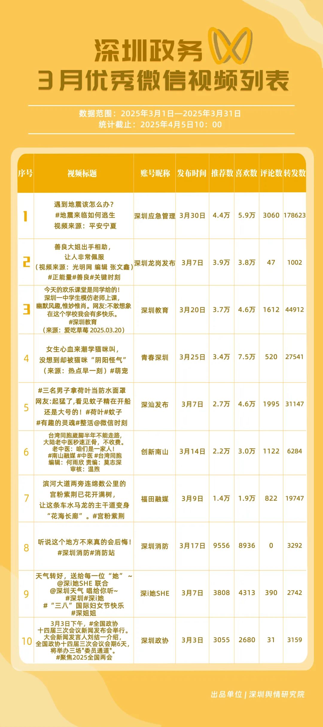 3月,獲“深圳優(yōu)秀政務微信視頻號”稱號的分別是“深圳應急管理”“深圳教育”“深汕發(fā)布”“青春深圳”“創(chuàng)新南山”“福田融媒”“深圳龍崗發(fā)布”“深圳光明”“文旅深圳”“深圳天氣”。其中,“深圳應急管理”以20余篇作品收獲超20萬次轉(zhuǎn)發(fā),躍居第一名,一期有關“地震來臨如何逃生”的視頻收獲超17萬次轉(zhuǎn)發(fā),展現(xiàn)了其內(nèi)容的高實用性?!吧钲诮逃薄吧钌前l(fā)布”位于榜單第二、三位,總分超90分,反映出兩賬號在民生教育、區(qū)域宣傳領域擁有較好傳播效果。“青春深圳”“創(chuàng)新南山”“福田融媒”等賬號也在3月發(fā)布優(yōu)質(zhì)視頻內(nèi)容,展現(xiàn)了深圳政務新媒體在視頻號平臺宣傳的創(chuàng)新探索。