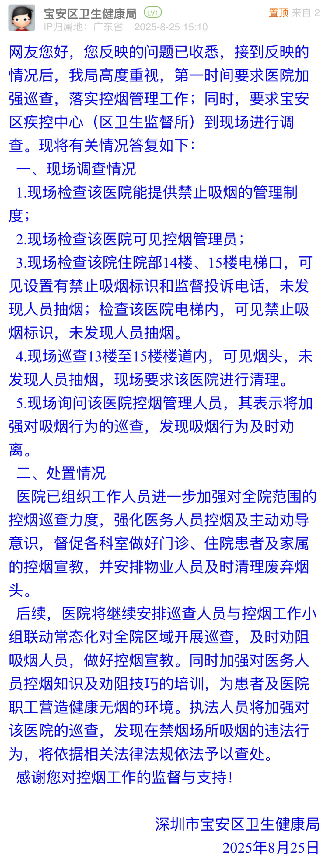 優(yōu)化建議:接到市民反饋后,寶安區(qū)衛(wèi)生健康局快速組織現(xiàn)場(chǎng)調(diào)查,核實(shí)醫(yī)院有禁煙制度、控?zé)煿芾韱T在崗,基礎(chǔ)控?zé)煷胧┖瞬榈轿唬档命c(diǎn)贊。但回應(yīng)中多次強(qiáng)調(diào)“未發(fā)現(xiàn)人員抽煙”,回避對(duì)歷史吸煙行為處置、煙頭來(lái)源及勸阻機(jī)制失效的解釋,與市民關(guān)切脫節(jié),難以消除市民對(duì)醫(yī)院日???zé)熌芰Φ膿?dān)憂,建議完善具體控?zé)煷胧?,如加裝煙感報(bào)警裝置,建立核查公示制度等,筑牢“無(wú)煙醫(yī)院”防線。