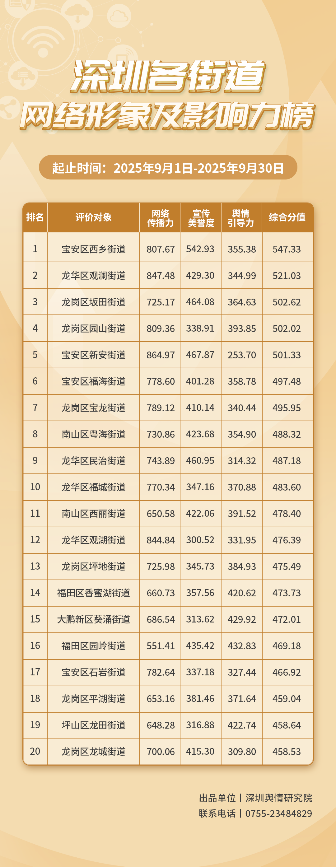 9月,各街道主動(dòng)深入研究社交平臺(tái)的傳播特性,在此基礎(chǔ)上進(jìn)一步完善并拓寬基層治理的路徑與模式。《深圳各街道網(wǎng)絡(luò)形象及影響力榜》(9月榜單)已編制完成,對(duì)各街道在網(wǎng)絡(luò)空間的展現(xiàn)及其影響力進(jìn)行了全面的觀察與評(píng)估。本次榜單的數(shù)據(jù)統(tǒng)計(jì)時(shí)間跨度為2025年9月1日至9月30日。