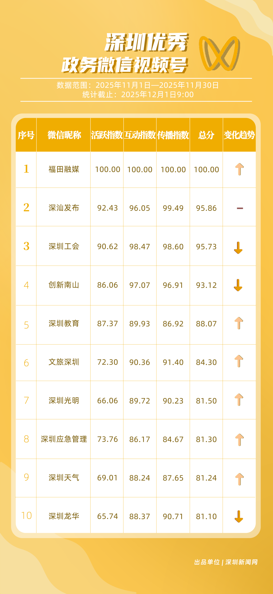 11月,深圳政務(wù)新媒體矩陣持續(xù)深耕內(nèi)容生態(tài),各單位依托平臺特色深化服務(wù)效能,福田區(qū)、南山區(qū)、市衛(wèi)生健康委員會、龍崗區(qū)、市總工會、深汕特別合作區(qū)、市氣象局(臺)、中國共產(chǎn)主義青年團深圳市委員會、龍華區(qū)、市應(yīng)急管理局的新媒體矩陣入選“深圳優(yōu)秀政務(wù)新媒體矩陣”榜單。11月,福田區(qū)新媒體矩陣憑借在微信視頻號、微博平臺的優(yōu)秀內(nèi)容,綜合得分達到94.51分,位列第一;南山區(qū)新媒體矩陣則依托在抖音平臺的滿分突破,以93.99分位居第二;市衛(wèi)生健康委員會新媒體矩陣在微信公眾號持續(xù)輸出優(yōu)質(zhì)內(nèi)容,總分排名第三位。此外,龍崗區(qū)、市總工會、深汕特別合作區(qū)新媒體矩陣持續(xù)聚焦市民需求,排名相對靠前,展現(xiàn)了深圳政務(wù)新媒體矩陣的活力。