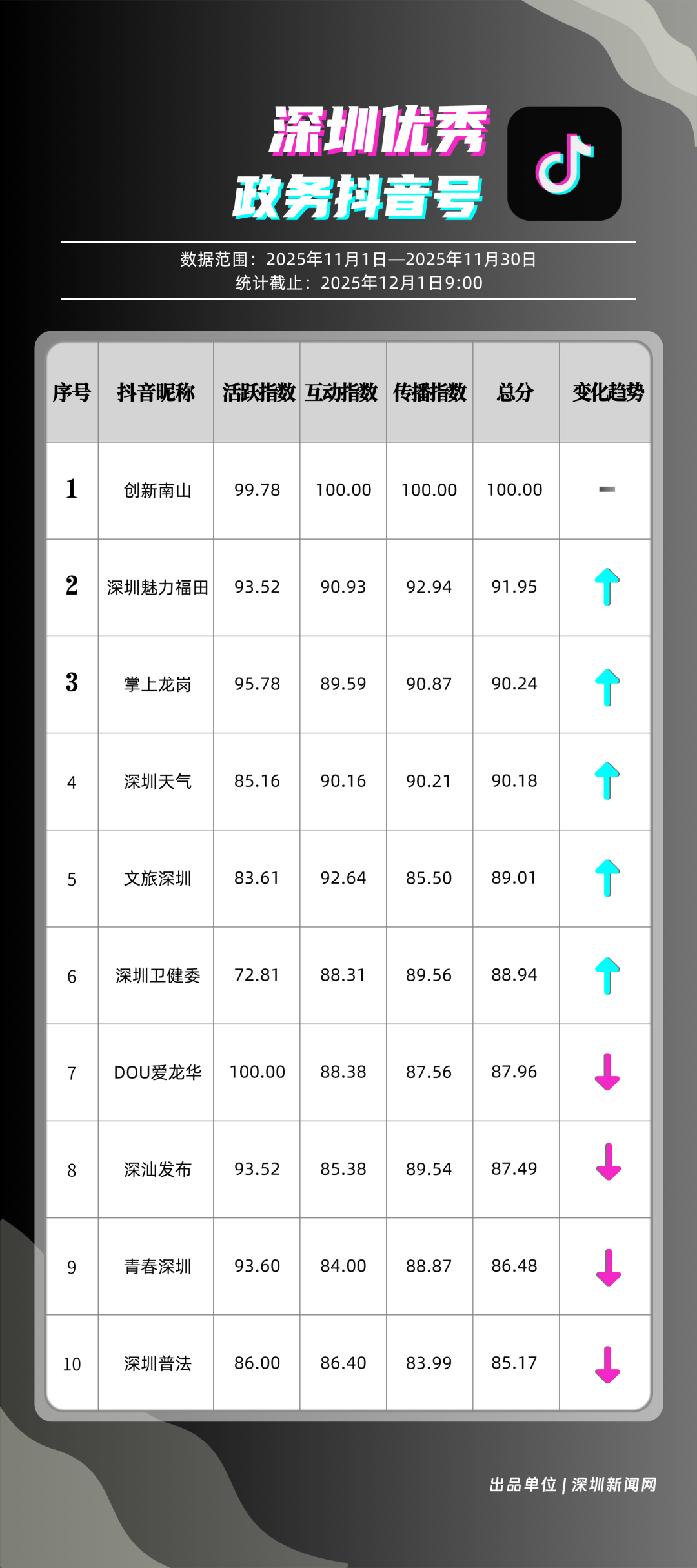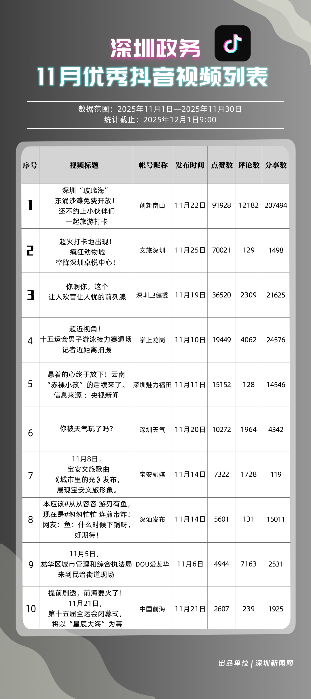 11月,獲得“優(yōu)秀政務(wù)抖音號”稱號的是“創(chuàng)新南山”“深圳魅力福田”“掌上龍崗”“深圳天氣”“文旅深圳”“深圳衛(wèi)健委”“DOU愛龍華”“深汕發(fā)布”“青春深圳”“深圳普法”。“創(chuàng)新南山”多篇文旅、健康及出行相關(guān)內(nèi)容分享超10萬次,在互動、傳播方面表現(xiàn)亮眼,蟬聯(lián)榜首;“深圳魅力福田”在各方面指數(shù)評分較為均衡,位列第二名;“掌上龍崗”在活躍指數(shù)得分較高,能夠較好均衡內(nèi)容數(shù)量與質(zhì)量,位居第三,排名較上期有所提高。“深圳天氣”“文旅深圳”等賬號緊隨其后,得分均在90分上下。上榜優(yōu)秀政務(wù)抖音號通過深耕內(nèi)容創(chuàng)作,收獲了高點贊、高分享的傳播效果,也推動評論區(qū)形成正向互動生態(tài),最終以優(yōu)質(zhì)內(nèi)容為核心載體,增強政務(wù)賬號影響力。