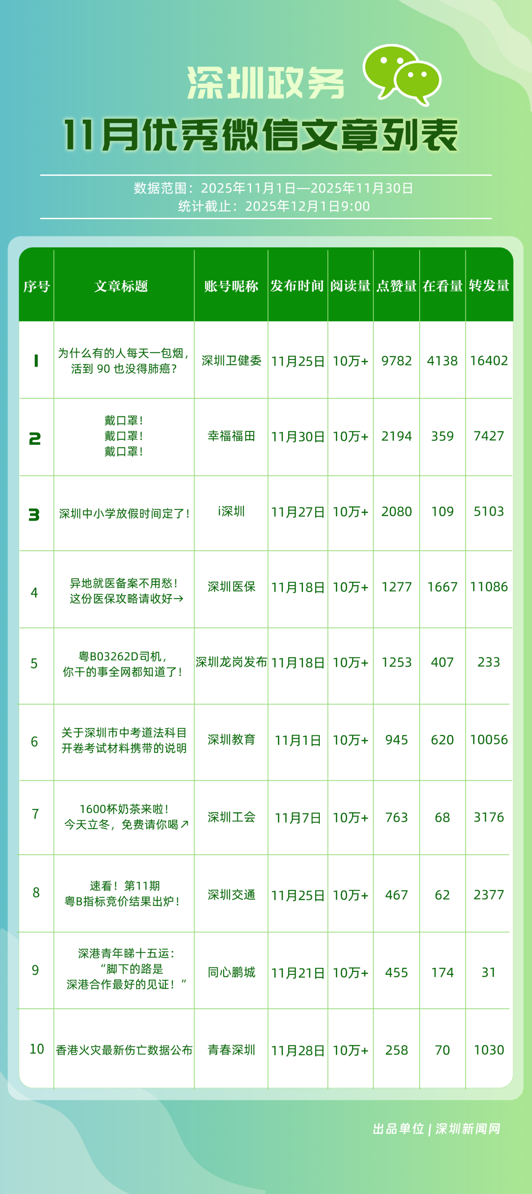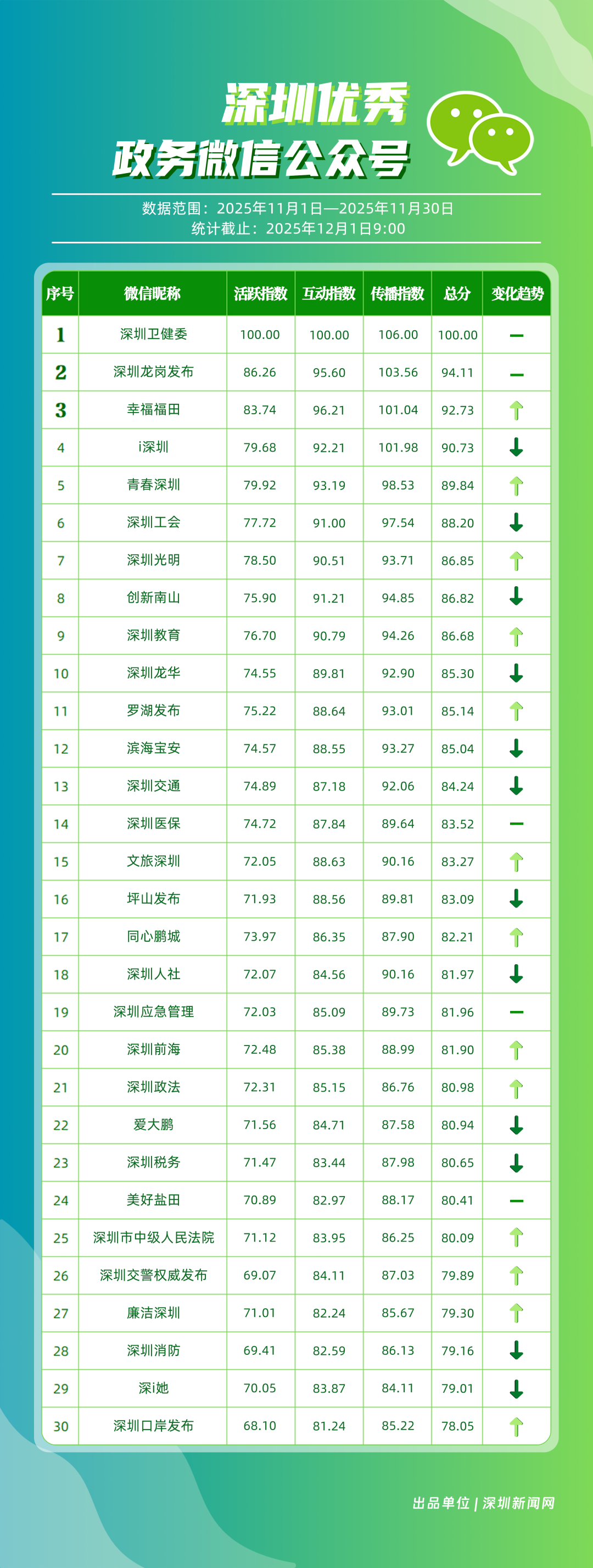 11月,“深圳衛(wèi)健委”“深圳龍崗發(fā)布”“幸福福田”“i深圳”“青春深圳”“深圳工會”“深圳光明”“創(chuàng)新南山”“深圳教育”“深圳龍華”等30個政務(wù)微信公眾號榮登“深圳優(yōu)秀政務(wù)微信公眾號”榜單。11月,“深圳衛(wèi)健委”在活躍、互動、傳播方面均取得較好成效,以滿分位于榜單首位;“深圳龍崗發(fā)布”在傳播、互動指數(shù)得分較高,十余篇文章閱讀量超10萬次,位居榜單第二;“幸福福田”持續(xù)發(fā)布優(yōu)秀內(nèi)容,排名第三。“i深圳”“青春深圳”“深圳工會”等政務(wù)賬號在信息發(fā)布中拓展信息維度、深化服務(wù)場景,評分在88分以上。上榜微信公眾號以高質(zhì)量內(nèi)容為核心抓手,在政務(wù)傳播賽道樹立了標桿形象,成為兼具影響力與公信力的典范。