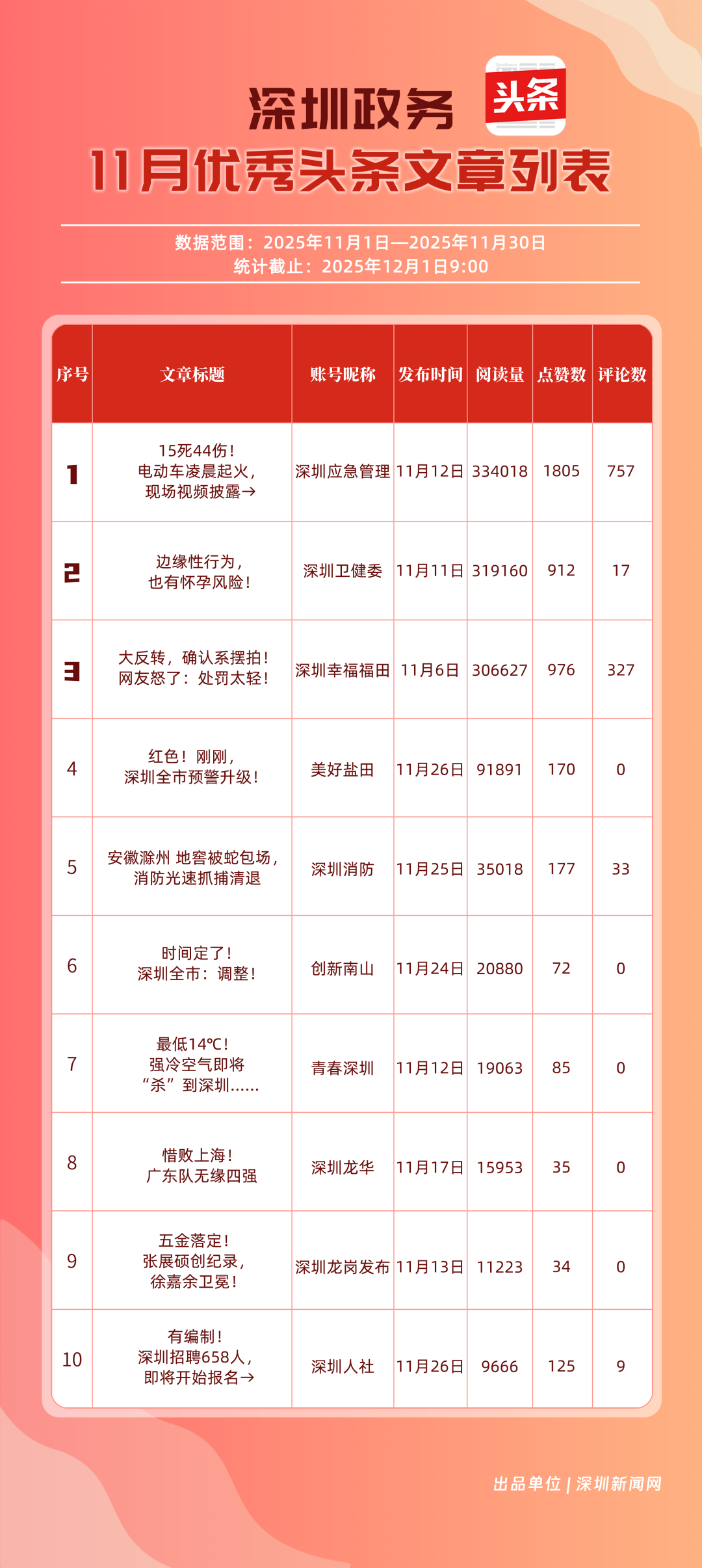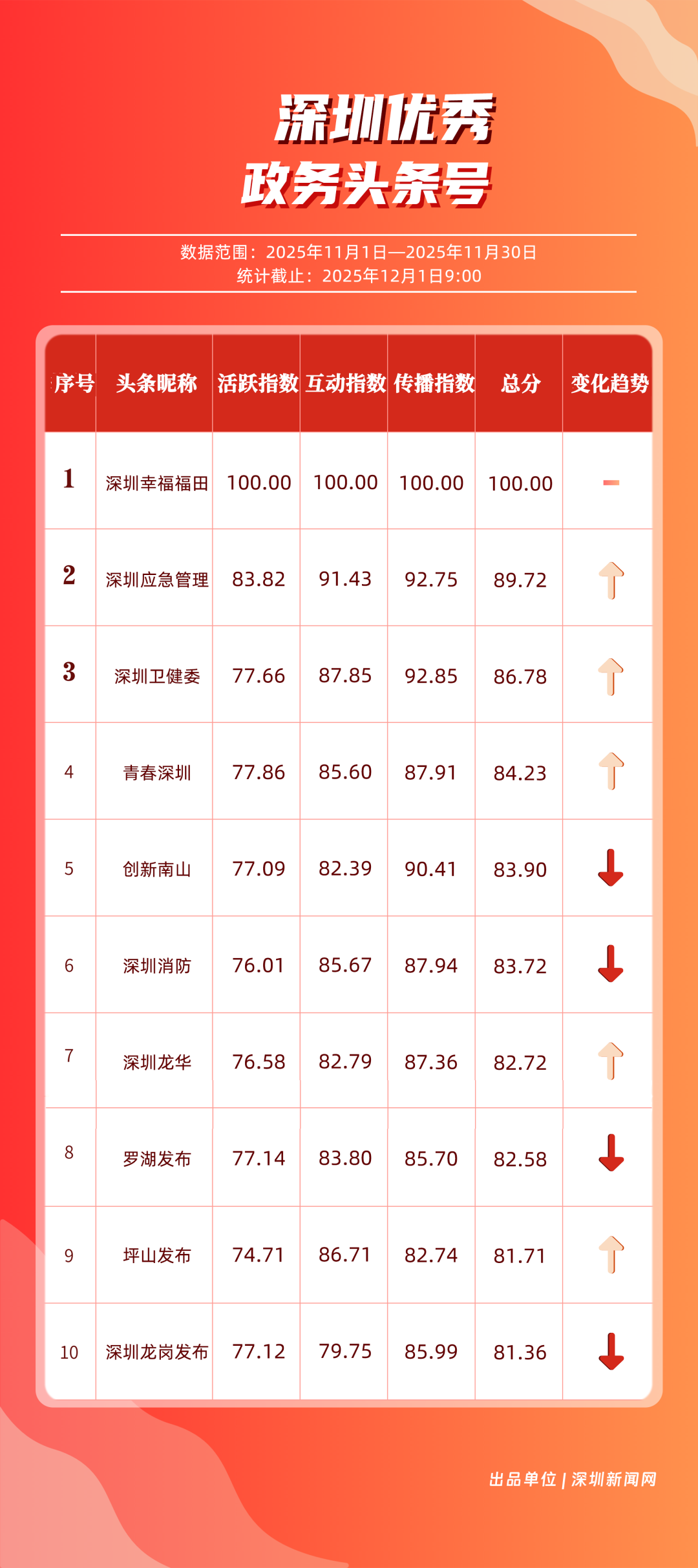 11月,“深圳幸福福田”“深圳應(yīng)急管理”“深圳衛(wèi)健委”“青春深圳”“創(chuàng)新南山”“深圳消防”“深圳龍華”“羅湖發(fā)布”“坪山發(fā)布”“深圳龍崗發(fā)布”共10個政務(wù)頭條號入選“優(yōu)秀政務(wù)頭條號”榜單。“深圳幸福福田”發(fā)揮穩(wěn)定,以滿分成績蟬聯(lián)榜首,彰顯出強大的政務(wù)傳播力與影響力;“深圳應(yīng)急管理”積極發(fā)布應(yīng)急、安全類內(nèi)容,位居第二;“深圳衛(wèi)健委”則以優(yōu)質(zhì)健康類信息吸引市民關(guān)注,排名上升至第3位?!扒啻荷钲凇薄皠?chuàng)新南山”“深圳消防”得分在83分以上。相關(guān)上榜賬號以內(nèi)容創(chuàng)新為紐帶,聚焦民生,為城市治理現(xiàn)代化與民生服務(wù)精細化注入了鮮活力量。
