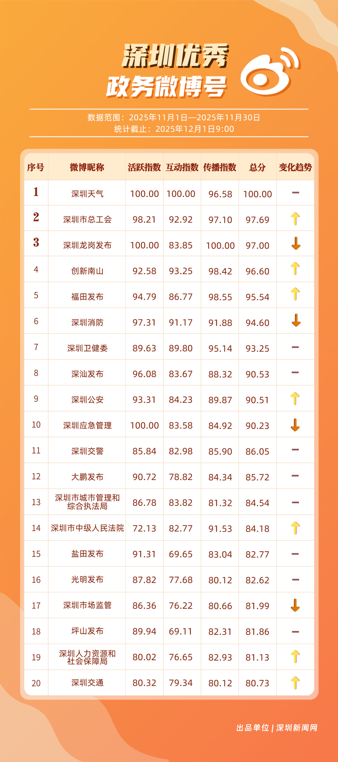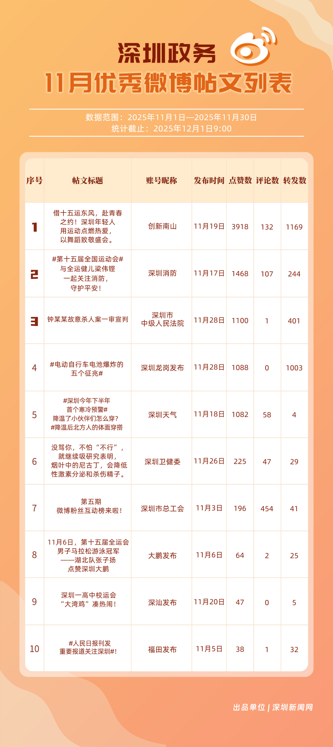 11月,20個賬號入選“優(yōu)秀政務(wù)微博號”榜單,其中包括:“深圳天氣”“深圳市總工會”“深圳龍崗發(fā)布”“創(chuàng)新南山”“福田發(fā)布”“深圳消防”“深圳衛(wèi)健委”“深汕發(fā)布”“深圳公安”“深圳應(yīng)急管理”等。其中,“深圳天氣”高頻次發(fā)布天氣類信息,受到網(wǎng)民肯定,蟬聯(lián)榜首;“深圳市總工會”發(fā)布互動抽獎、十五運等多元內(nèi)容,排名提升至第二;“深圳龍崗發(fā)布”在傳播指數(shù)獲得較高得分,助力其位列第三。上榜優(yōu)秀政務(wù)微博賬號以優(yōu)秀內(nèi)容提升賬號競爭力,贏得公眾認可,實現(xiàn)了政務(wù)信息的有效傳播,為政務(wù)新媒體的內(nèi)容運營與價值傳遞提供參考。
