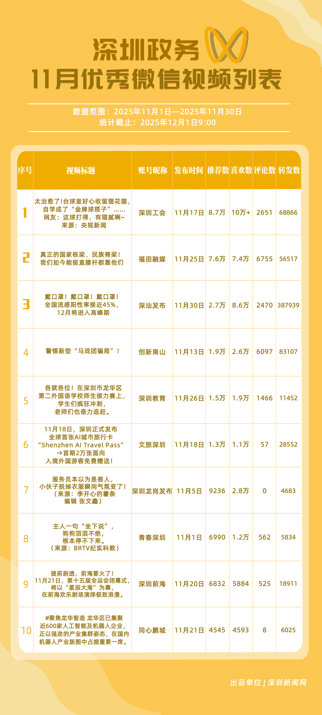 11月,“福田融媒”“深汕發(fā)布”“深圳工會”“創(chuàng)新南山”“深圳教育”“文旅深圳”“深圳光明”“深圳應(yīng)急管理”“深圳天氣”“深圳龍華”榮獲“優(yōu)秀政務(wù)微信視頻號”稱號。“福田融媒”月總轉(zhuǎn)發(fā)量超60萬次,各方面發(fā)揮穩(wěn)定,位居榜單第一;“深汕發(fā)布”一條“流感陽性”視頻提醒市民關(guān)注健康信息,單條視頻轉(zhuǎn)發(fā)超30萬次,助推其位列榜單第二名;“深圳工會”積極轉(zhuǎn)載網(wǎng)絡(luò)熱門信息,內(nèi)容多元,位列榜單第三名。“創(chuàng)新南山”“深圳教育”等賬號緊隨其后。上榜微信視頻號以輕量化短視頻為載體,將政務(wù)信息轉(zhuǎn)化為公眾喜聞樂見的內(nèi)容形式,最終打造出兼具傳播力與親和力的政務(wù)宣傳新名片。