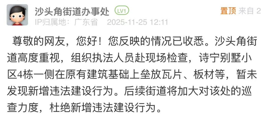優(yōu)化建議:針對網(wǎng)民投訴的小區(qū)違建問題,街道回應(yīng)僅以“未發(fā)現(xiàn)新增違法建設(shè)行為”簡單回復(fù),尚有完善空間。若該點位存在建設(shè)年代久遠、權(quán)屬界定模糊、涉及多主體協(xié)調(diào)等客觀難點,可適度說明,并在回應(yīng)中補充核查細節(jié),說明后續(xù)處置方向與階段計劃,讓回應(yīng)更具可信度和實操性,回應(yīng)市民對“依法履職”的期待。
