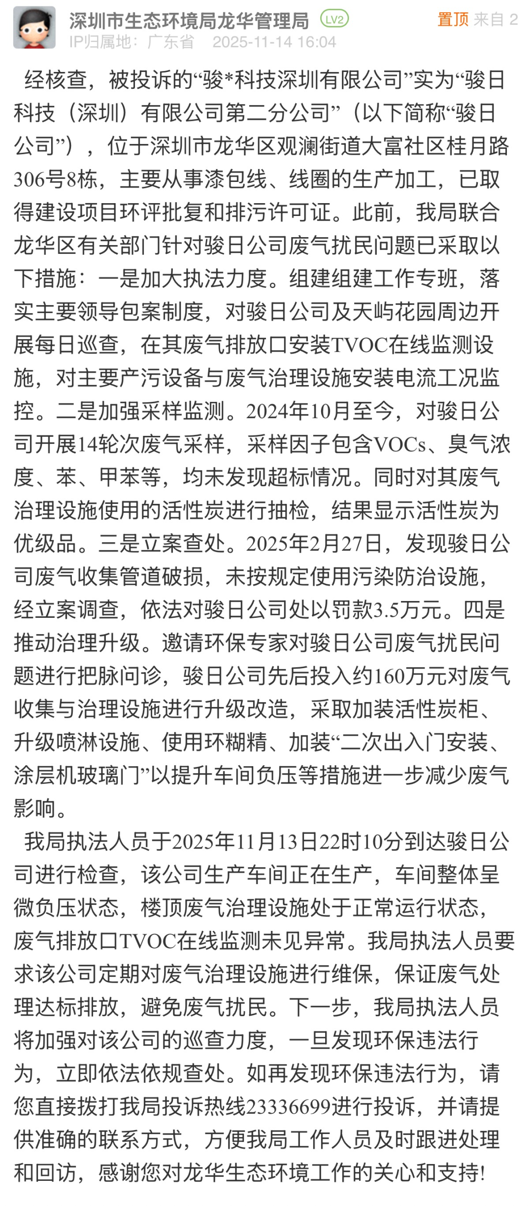 優(yōu)化建議:針對市民反映的工業(yè)廢氣擾民問題,相關(guān)部門雖采取巡查監(jiān)測、立案查處、推動設(shè)備升級等舉措,但未能實質(zhì)性化解居民困擾。在該問政網(wǎng)帖的評論區(qū),有多位業(yè)主留言反映,近一年來“天天聞到臭氣”,并對“采樣均未發(fā)現(xiàn)超標(biāo)情況”的回復(fù)表示質(zhì)疑。建議相關(guān)部門在依托專業(yè)設(shè)備檢測的同時,結(jié)合居民“嗅辨”反饋開展精準(zhǔn)溯源,切實回應(yīng)群眾對清新環(huán)境的基本訴求,推動治理從“數(shù)據(jù)達標(biāo)”轉(zhuǎn)向“群眾滿意”。