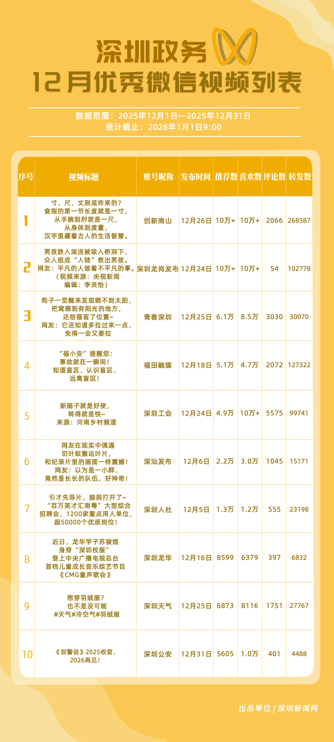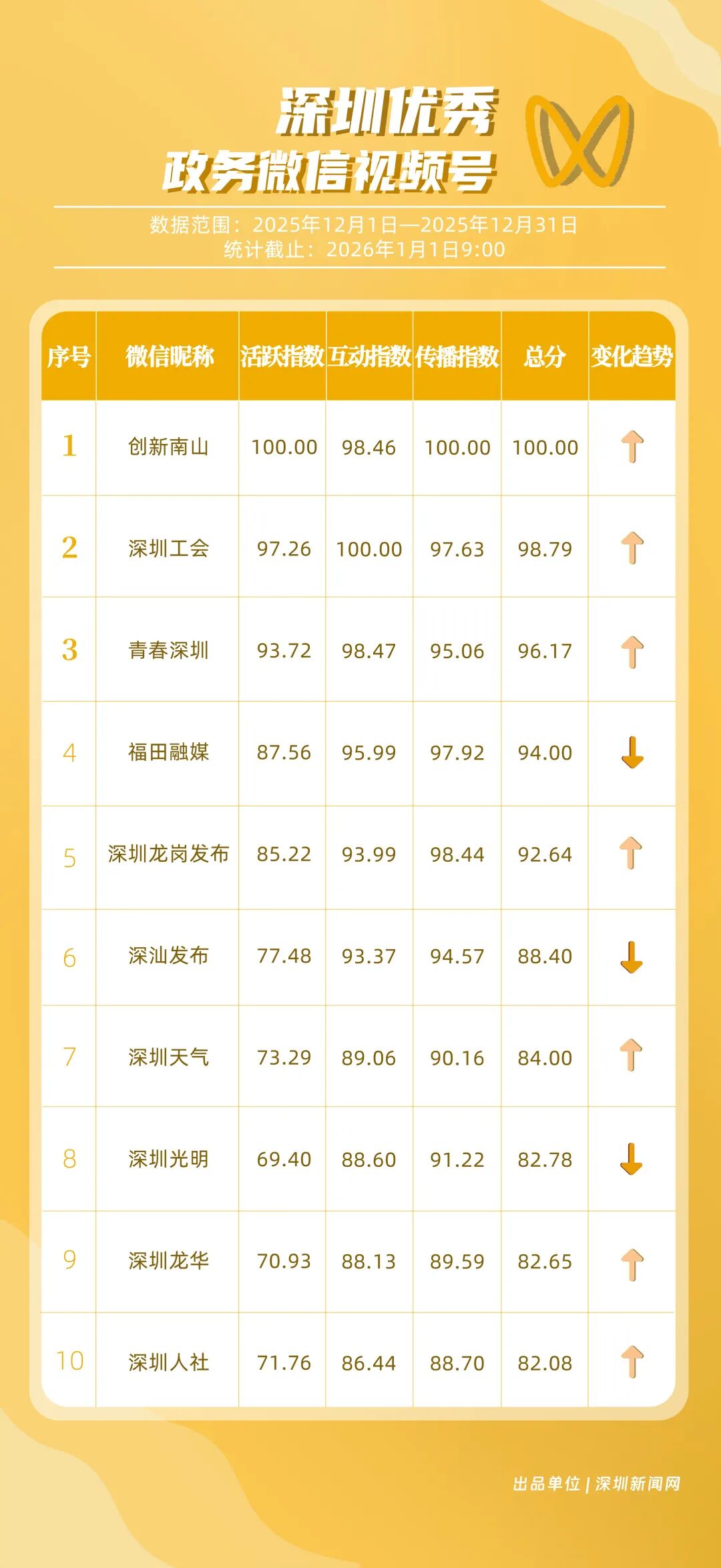 12月,“創(chuàng)新南山”“深圳工會”“青春深圳”“福田融媒”“深圳龍崗發(fā)布”“深汕發(fā)布”“深圳天氣”“深圳光明”“深圳龍華”“深圳人社”榮獲“優(yōu)秀政務微信視頻號”稱號。“創(chuàng)新南山”活躍指數(shù)、傳播指數(shù)均獲滿分,月作品總轉發(fā)量超70萬,領跑榜單;“深圳工會”積極發(fā)布熱點、民生類內容,精準對接市民需求,排名上升至第二名;“青春深圳”互動指數(shù)超98分,以高互動量位列榜單第三名。“福田融媒”“深圳龍崗發(fā)布”兩賬號立足區(qū)域特色深耕內容,得分超90分。上榜微信視頻號以輕量化短視頻為載體,傳播公眾喜聞樂見的政務、民生內容,打造出兼具傳播力與親和力的政務宣傳新名片。