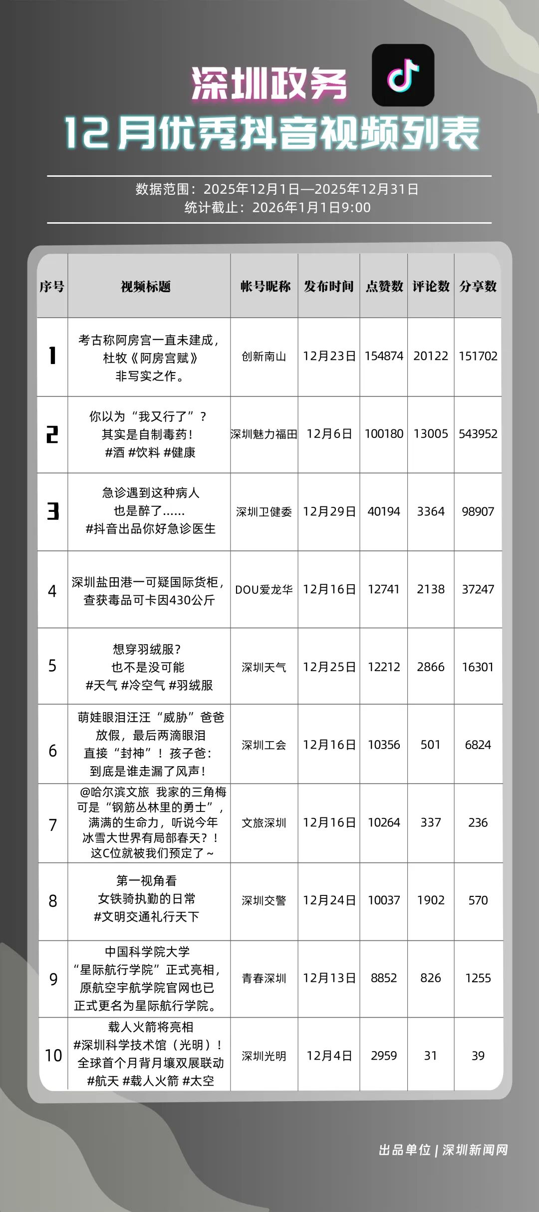 12月,獲得“優(yōu)秀政務抖音號”稱號的是“創(chuàng)新南山”“深圳魅力福田”“深圳衛(wèi)健委”“深圳天氣”“DOU愛龍華”“青春深圳”“深圳交警”“深汕發(fā)布”“深圳工會”“文旅深圳”?!皠?chuàng)新南山”積極傳播傳統(tǒng)文化、民生健康等多元內容,當月視頻總點贊數(shù)超120萬,位居榜首;“深圳魅力福田”內容激發(fā)用戶主動轉發(fā)熱情,在傳播指數(shù)評分較高,位列第二名;“深圳衛(wèi)健委”聚焦民生健康話題,產(chǎn)出高質量視頻內容,排名上升至第三?!吧钲谔鞖狻薄癉OU愛龍華”“青春深圳”等賬號評分均在86分以上,反映出賬號的內容質量與用戶粘性突出。上榜政務抖音號在短視頻傳播賽道持續(xù)深耕,憑借精準的內容定位與創(chuàng)新的傳播手法,成功打造出極具影響力的政務傳播矩陣。