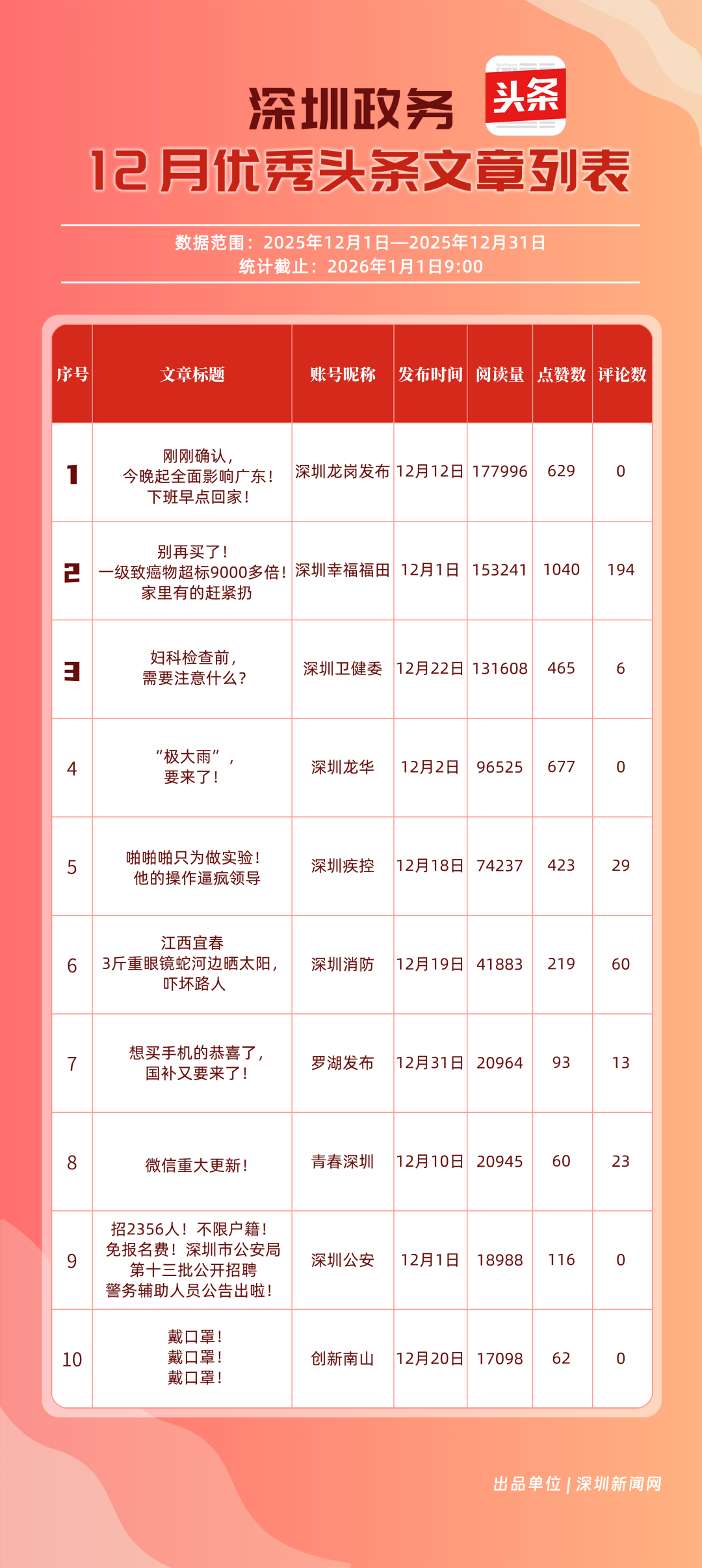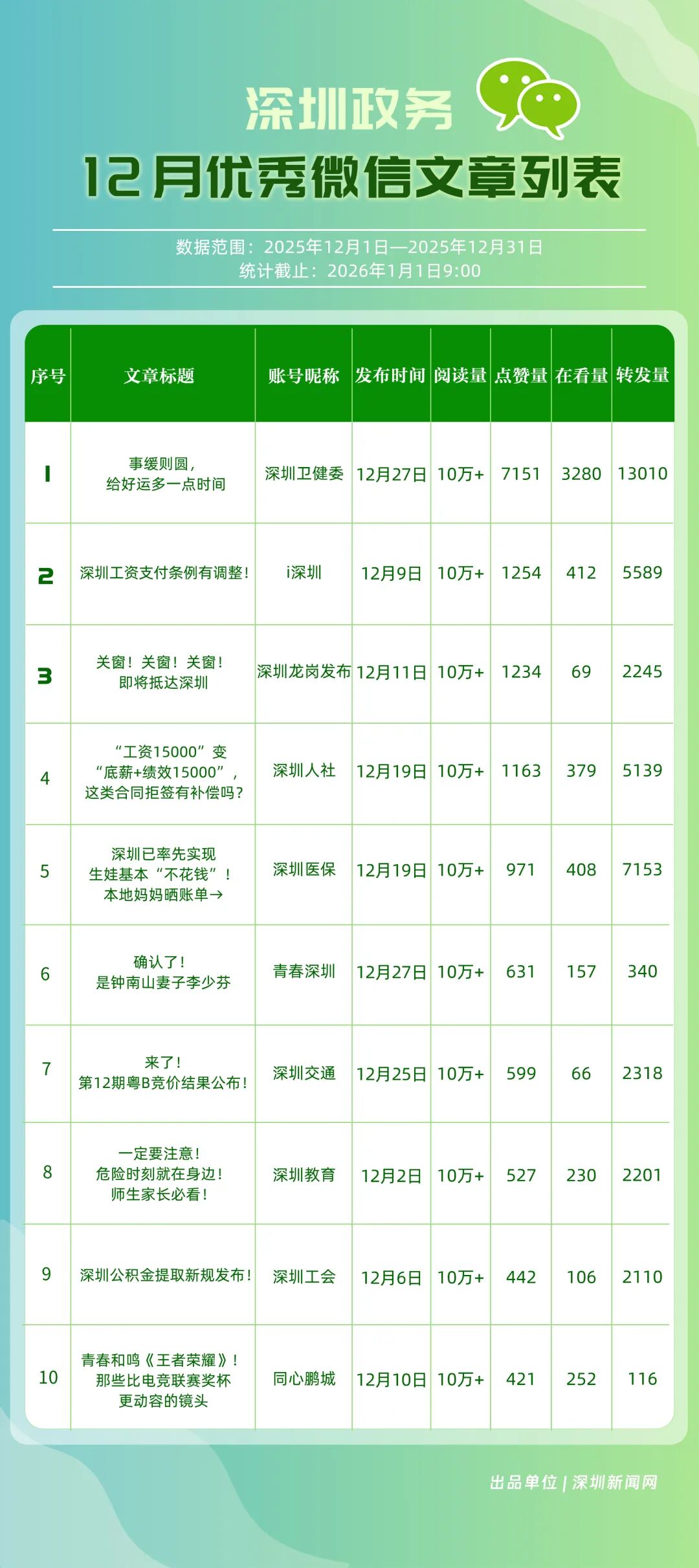 12月,“深圳衛(wèi)健委”“深圳龍崗發(fā)布”“幸福福田”“i深圳”“青春深圳”“深圳光明”“深圳工會”“創(chuàng)新南山”“深圳龍華”“羅湖發(fā)布”等30個政務微信公眾號榮登“深圳優(yōu)秀政務微信公眾號”榜單。12月榜單中,頭部政務賬號優(yōu)勢穩(wěn)固,腰部賬號競爭激烈?!吧钲谛l(wèi)健委”延續(xù)強勁表現(xiàn),在活躍、互動、傳播維度均斬獲滿分,60余篇文章閱讀超10萬,蟬聯(lián)榜首;“深圳龍崗發(fā)布”在互動、傳播方面表現(xiàn)亮眼,穩(wěn)居榜單第二;“幸福福田”也在互動、傳播方面具備一定優(yōu)勢,以穩(wěn)定的內容輸出與用戶口碑,居于榜單第三。“深圳光明”“深圳龍華”“羅湖發(fā)布”等政務賬號不斷拓展信息發(fā)布維度、深化服務場景打造,排名較上期有所提升。上榜微信公眾號以高質量內容為核心競爭力,在政務傳播賽道持續(xù)發(fā)力,為推動政務信息公開、服務民生需求搭建了高效的溝通橋梁。