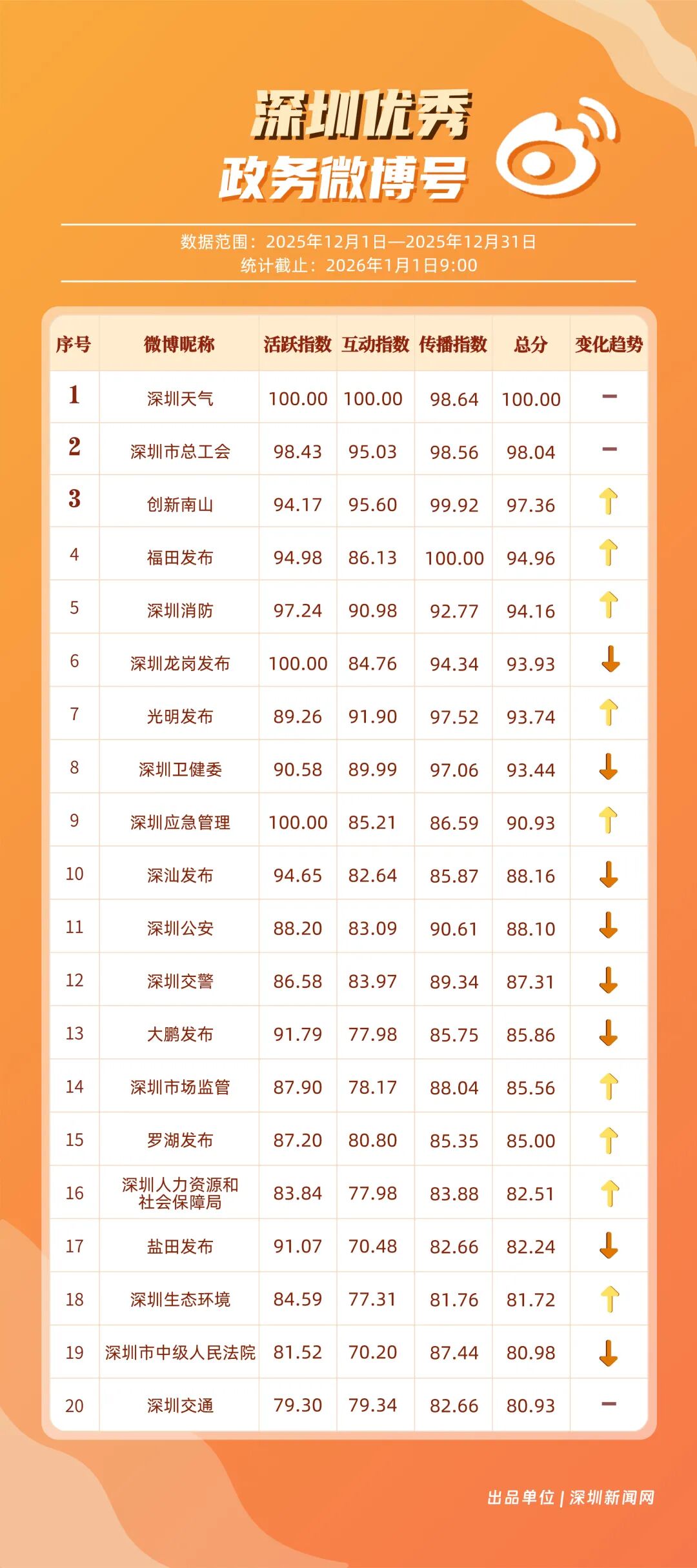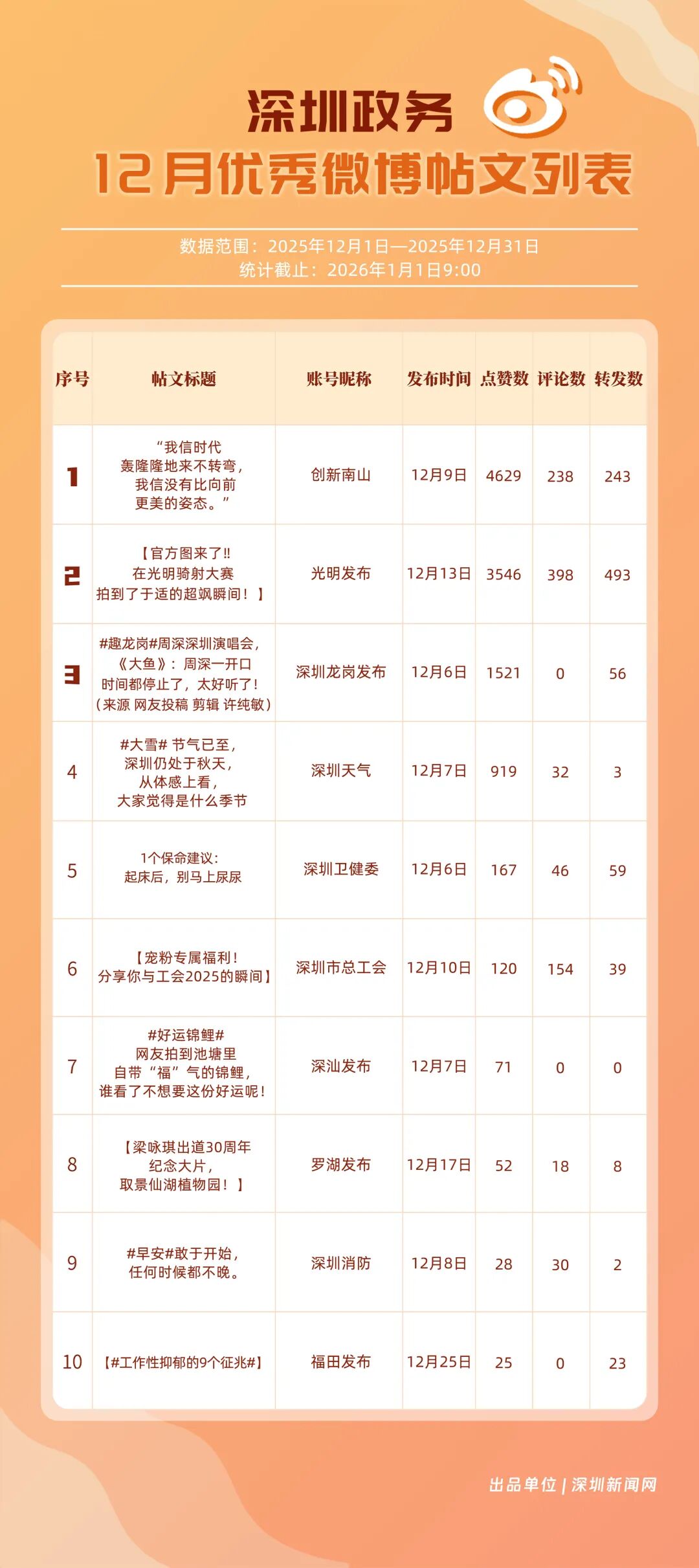12月,20個賬號入選“優(yōu)秀政務微博號”榜單,其中包括:“深圳天氣”“深圳市總工會”“創(chuàng)新南山”“福田發(fā)布”“深圳消防”“深圳龍崗發(fā)布”“光明發(fā)布”“深圳衛(wèi)健委”“深圳應急管理”“深汕發(fā)布”等。其中,“深圳天氣”精準化發(fā)布天氣信息,高頻次與網(wǎng)民互動,以滿分成績蟬聯(lián)榜首,彰顯其在民生服務領域的核心價值;“深圳市總工會”積極發(fā)布互動、福利類內容,獲得較高用戶參與度與賬號影響力,居于榜單第二;“創(chuàng)新南山”傳播指數(shù)得分超99分,躋身榜單第三?!案L锇l(fā)布”“深圳消防”等賬號聚焦民生熱點、強化互動運營,居于榜單前列,且排名有所提升。12月上榜政務微博賬號持續(xù)發(fā)力,實現(xiàn)了政務信息的有效傳播,為政務新媒體的內容運營與價值傳遞提供了可借鑒的實踐樣本。