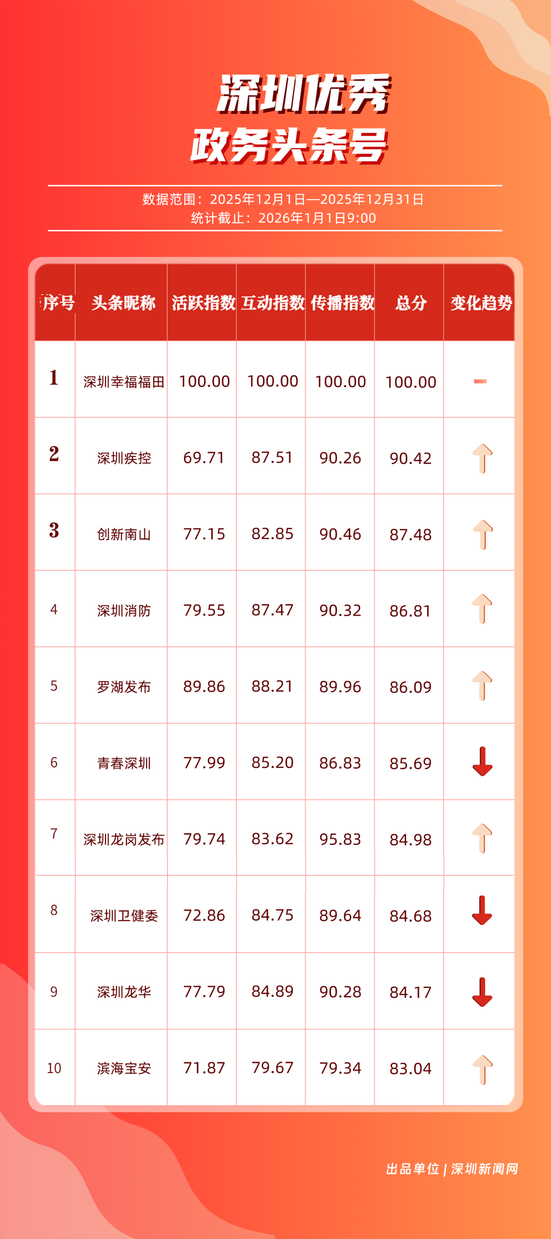 12月,深圳政務新媒體矩陣持續(xù)深耕內容生態(tài),各單位依托平臺特色深化服務效能,南山區(qū)、福田區(qū)、市衛(wèi)生健康委員會、市總工會、龍崗區(qū)、市氣象局(臺)、光明區(qū)、中國共產(chǎn)主義青年團深圳市委員會、龍華區(qū)、深汕特別合作區(qū)的新媒體矩陣入選“深圳優(yōu)秀政務新媒體矩陣”榜單。12月,南山區(qū)新媒體矩陣中,“創(chuàng)新南山”賬號在抖音平臺保持高質量創(chuàng)作態(tài)勢,單賬號單月視頻總點贊量突破120萬,視頻號平臺同樣表現(xiàn)亮眼,單月視頻總轉發(fā)量超70萬,憑借雙平臺滿分的傳播表現(xiàn),位居榜單首位;福田區(qū)新媒體矩陣表現(xiàn)均衡穩(wěn)定,在各平臺得分均在92分以上,以93.94分的總成績位列第二;市衛(wèi)生健康委員會新媒體矩陣在微信公眾號持續(xù)輸出專業(yè)優(yōu)質內容,在該平臺獲得滿分,助力其以92.21分的總分排名第三位。此外,市總工會、龍崗區(qū)新媒體矩陣總分均超90分,以“各美其美”的發(fā)展態(tài)勢,展現(xiàn)深圳政務新媒體矩陣的蓬勃生機。
