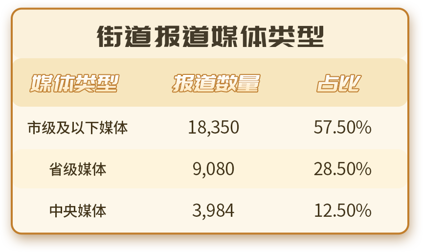 先看媒體類型,全年報道中,市級及以下媒體占比57.5%,省級媒體占比28.5%,兩者合計超過八成。也就是說,街道的大部分傳播,首先發(fā)生在區(qū)域媒體體系之中,被本地社會所看見、討論和接收。這樣的分布并不意外。街道離居民最近,日常工作也最貼近城市運行的細部肌理,無論是基層治理、社區(qū)服務(wù),還是環(huán)境整治、民生保障,本身都帶有很強的屬地屬性,天然更容易進入本地媒體的觀察視野。